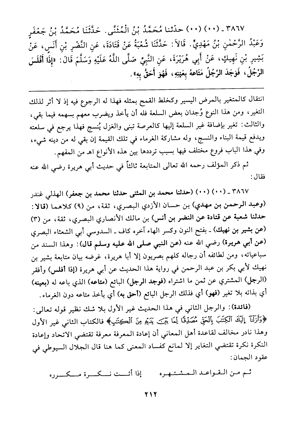 ٣٨٦٧ - (٠٠) (٠٠) (حدثنا محمد بن المثنى حدثنا محمد بن جعفر) الهذلي غندر (وعبد الرحمن بن مهدي) بن حسان الأزدي البصري، ثقة، من (٩) كلاهما (قالا: حدثنا شعبة عن قتادة عن النضر بن أنس) بن مالك الأنصاري البصري، ثقة، من (٣) (عن بشير بن نهيك) -بفتح النون وكسر الهاء آخره كاف- السدوسي أبي الشعثاء البصري (عن أبي هريرة) رضي الله عنه (عن النبي صلى الله عليه وسلم قال): وهذا السند من سباعياته، ومن لطائفه أن رجاله كلهم بصريون إلا أبا هريرة، غرضه بيان متابعة بشير بن نهيك لأبي بكر بن عبد الرحمن في رواية هذا الحديث عن أبي هريرة (إذا أفلس) وأفقر (الرجل) المشتري عن ثمن ما اشتراه (فوجد الرجل) البائع (متاعه) الذي باعه له (بعينه) أي بذاته بلا تغير (فهو) أي فذلك الرجل البائع (أحق به) أي بأخذ متاعه دون الغرماء.