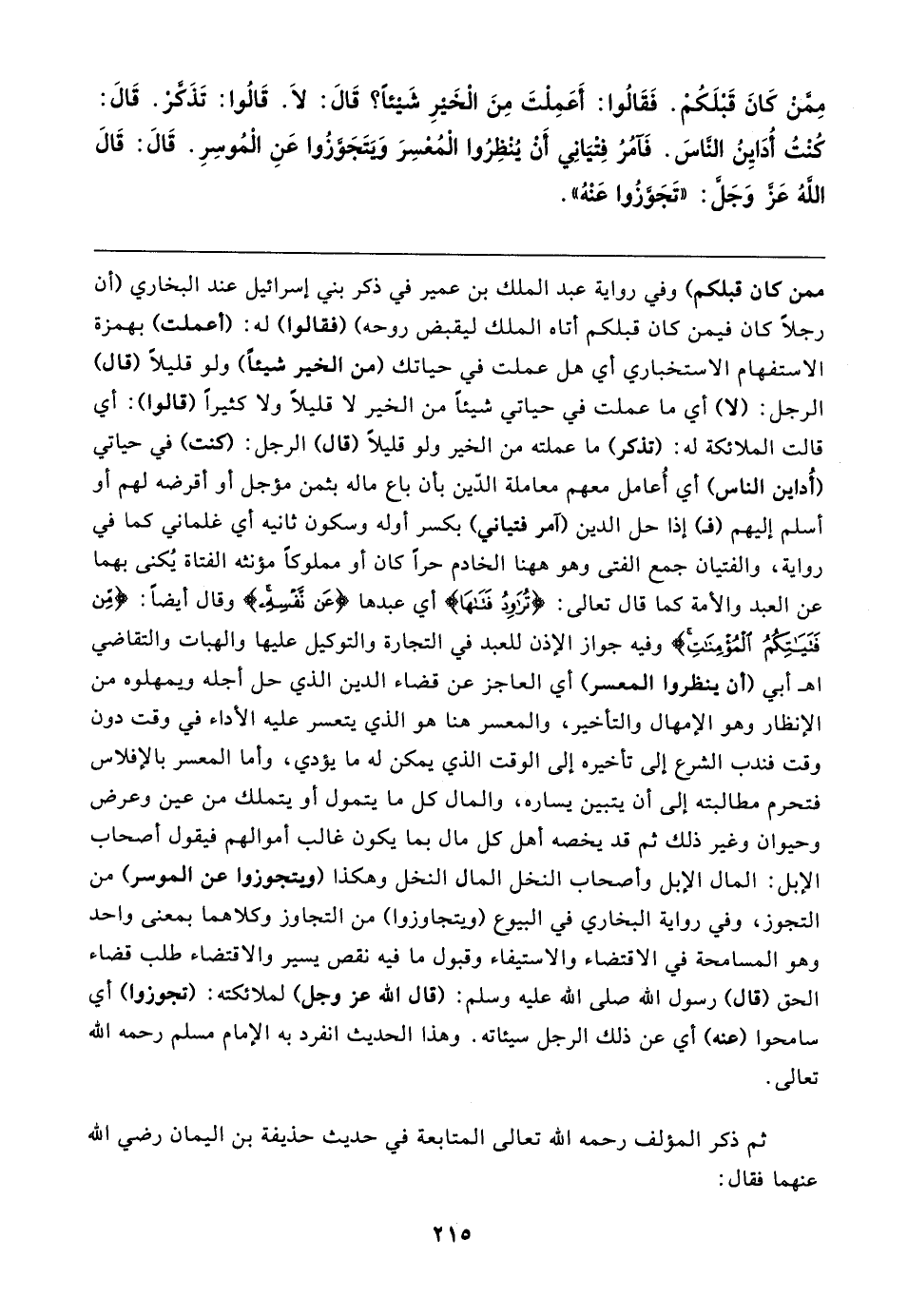 مِمَّنْ كَانَ قَبْلَكُمْ. فَقَالُوا: أَعَمِلْتَ مِنَ الْخَيرِ شَيئًا؟ قَال: لَا. قَالُوا: تَذَكَّرْ. قَال: كُنْتُ أُدَايِنُ النَّاسَ. فَآمُرُ فِتْيَانِي أَنْ يُنْظِرُوا الْمُعْسِرَ وَيَتَجَوَّزُوا عَنِ الْمُوسِرِ. قَال: قَال اللَّهُ عَزَّ وَجَلَّ: "تَجَوَّزُوا عَنْهُ"