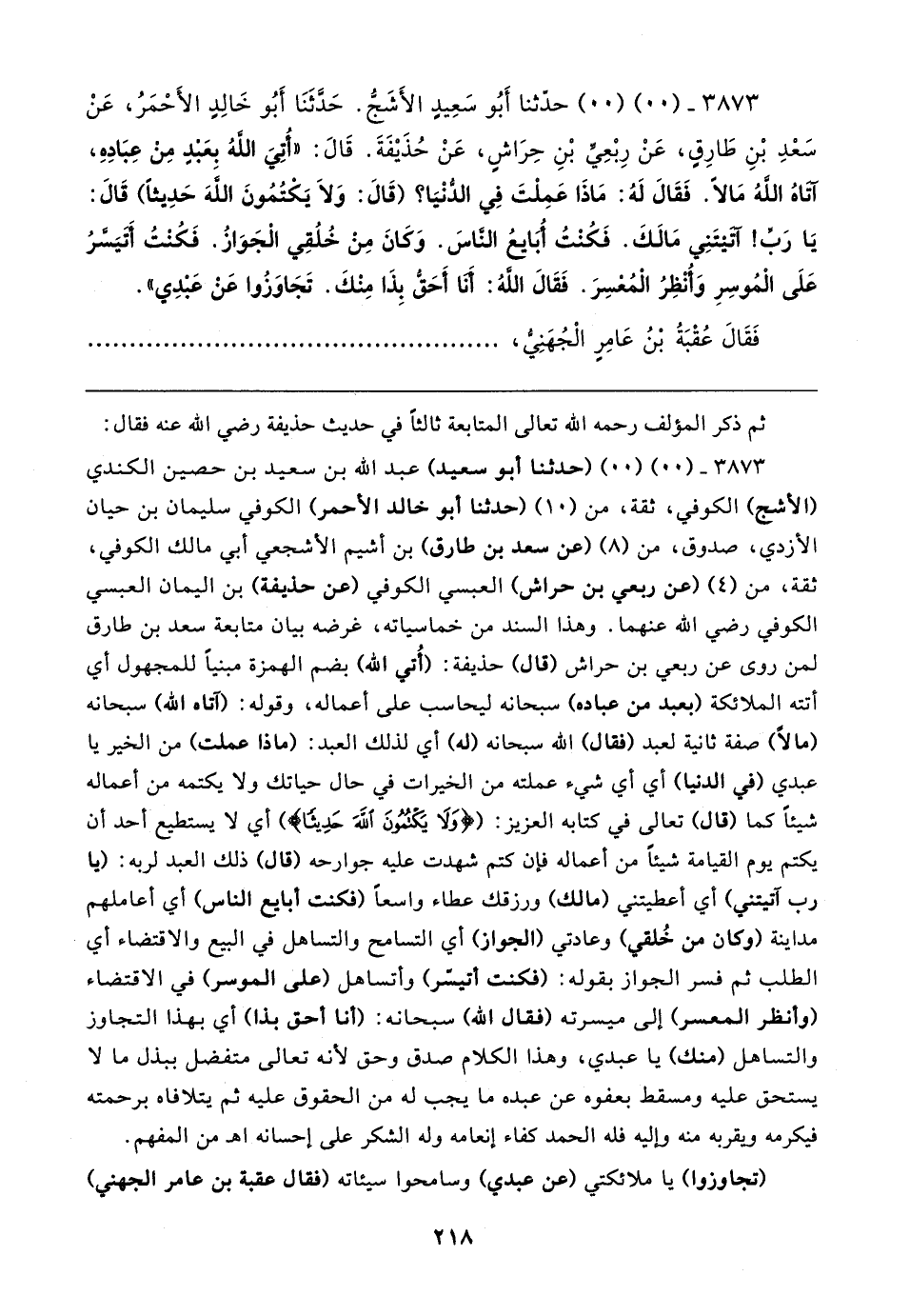 ٣٨٧٣ - (٠٠) (٠٠) حَدَّثَنَا أَبُو سَعِيدٍ الأَشَجُّ. حَدَّثَنَا أَبُو خَالِدٍ الأَحْمَرُ، عَنْ سَعْدِ بْنِ طَارِقٍ، عَنْ رِبْعِيِّ بْنِ حِرَاشٍ, عَنْ حُذَيفَةَ. قَال: "أُتِيَ اللَّهُ بِعَبْدٍ مِنْ عِبَادِهِ, آتَاهُ اللَّهُ مَالًا. فَقَال لَهُ: مَاذَا عَمِلْتَ فِي الدُّنْيَا؟ (قَال: وَلَا يَكْتُمُونَ اللَّهَ حَدِيثًا) قَال: يَا رَبِّ! آتَيتَنِي مَالكَ. فَكُنْتُ أُبَايِعُ النَّاسَ. وَكَانَ مِنْ خُلُقِي الْجَوَازُ. فَكُنْتُ أَتَيَسَّرُ عَلَى الْمُوسِرِ وَأُنْظِرُ الْمُعْسِرَ. فَقَال اللَّهُ: أَنَا أَحَقُّ بِذَا مِنْكَ. تَجَاوَزُوا عَنْ عَبْدِي".