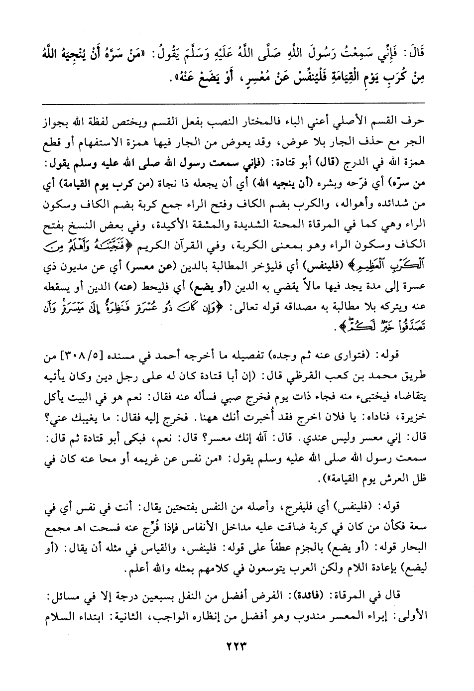 حرف القسم الأصلي أعني الباء فالمختار النصب بفعل القسم ويختص لفظة الله بجواز الجر مع حذف الجار بلا عوض، وقد يعوض من الجار فيها همزة الاستفهام أو قطع همزة الله في الدرج (قال) أبو قتادة: (فإنِّي سمعت رسول الله صلى الله عليه وسلم يقول: من سرّه) أي فرّحه وبشره (أن ينجيه الله) أي أن يجعله ذا نجاة (من كرب يوم القيامة) أي من شدائده وأهواله، والكرب بضم الكاف وفتح الراء جمع كربة بضم الكاف وسكون الراء وهي كما في المرقاة المحنة الشديدة والمشقة الأكيدة، وفي بعض النسخ بفتح الكاف وسكون الراء وهو بمعنى الكربة، وفي القرآن الكريم {فَنَجَّينَاهُ وَأَهْلَهُ مِنَ الْكَرْبِ الْعَظِيمِ} (فلينفس) أي فليؤخر المطالبة بالدين (عن معسر) أي عن مديون ذي عسرة إلى مدة يجد فيها مالًا يقضي به الدين (أو يضع) أي فليحط (عنه) الدين أو يسقطه عنه ويتركه بلا مطالبة به مصداقه قوله تعالى: {وَإِنْ كَانَ ذُو عُسْرَةٍ فَنَظِرَةٌ إِلَى مَيسَرَةٍ وَأَنْ تَصَدَّقُوا خَيرٌ لَكُمْ}.