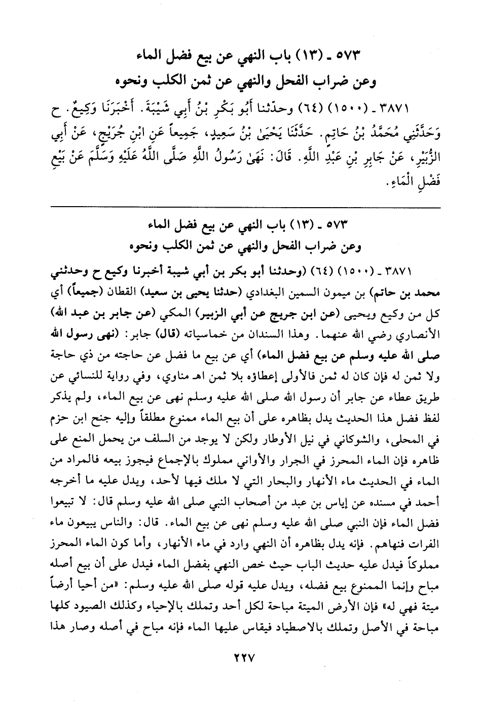 ٣٨٧١ - (١٥٠٠) (٦٤) وحدثنا أَبُو بَكْرِ بْنُ أبي شَيبَةَ. أَخْبَرَنَا وَكِيعٌ. ح وَحَدَّثَنِي مُحَمَّدُ بْنُ حَاتِمٍ. حَدَّثَنَا يَحْيَى بْنُ سَعِيدٍ، جَمِيعًا عَنِ ابْنِ جُرَيجٍ، عَنْ أبي الزُّبَيرِ، عَنْ جَابِرِ بْنِ عَبْدِ اللهِ. قَال: نَهَى رَسُولُ اللهِ صَلَّى الله عَلَيهِ وَسَلَّمَ عَنْ بَيعِ فَضْلِ الْمَاءِ