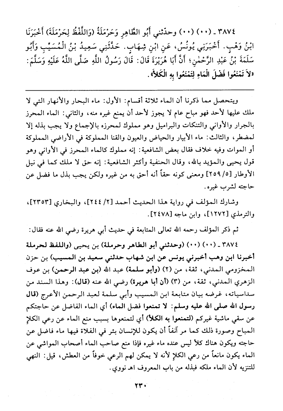 ٣٨٧٤ - (٠٠) (٠٠) وحدّثني أبُو الطَّاهِرِ وَحَرْمَلَةُ (وَاللَّفْظُ لِحَرْمَلَةَ) أَخْبَرَنَا ابْنُ وَهْبٍ. أَخْبَرَنِي يُونُسُ، عَنِ ابْنِ شِهَابٍ. حَدَّثَنِي سَعِيدُ بْنُ الْمُسَيِّبِ وَأَبُو سَلَمَةَ بْنُ عَبْدِ الرَّحْمنِ؛ أن أَبَا هُرَيرَةَ قَال: قَال رَسُولُ اللهِ صَلَّى الله عَلَيهِ وَسَلَّمَ: "لا تَمْنَعُوا فَضلَ الْمَاءِ لِتَمْنَعُوا بِهِ الْكَلأَ"