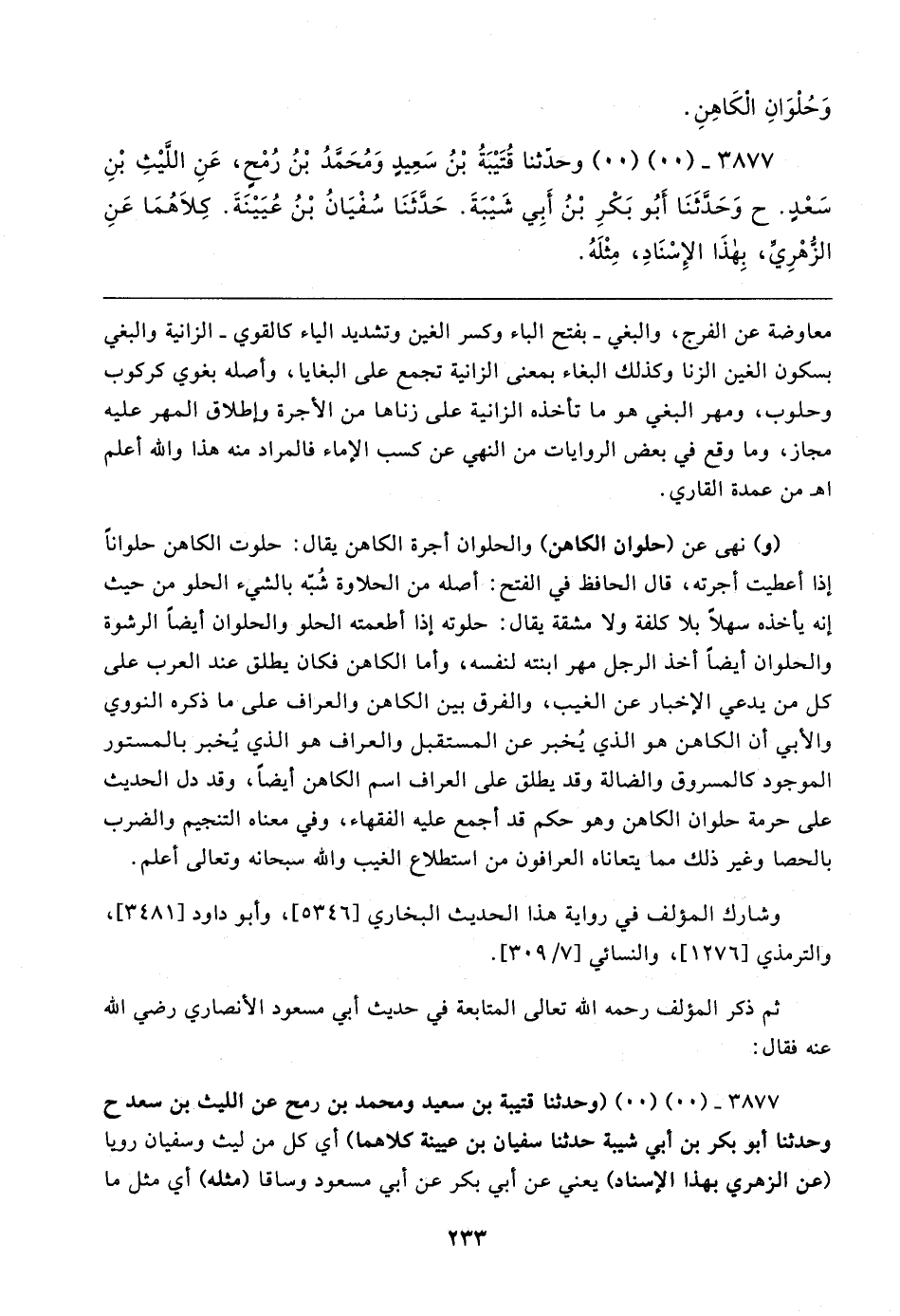 (و) نهى عن (حلوان الكلاهن) والحلوان أجرة الكاهن يقال: حلوت الكاهن حلوانًا إذا أعطيت أجرته، قال الحافظ في الفتح: أصله من الحلاوة شُبّه بالشيء الحلو من حيث إنه يأخذه سهلًا بلا كلفة ولا مشقة يقال: حلوته إذا أطعمته الحلو والحلوان أَيضًا الرشوة والحلوان أَيضًا أخذ الرَّجل مهر ابنته لنفسه، وأما الكاهن فكان يطلق عند العرب على كل من يدعي الإخبار عن الغيب، والفرق بين الكاهن والعراف على ما ذكره النووي والأبي أن الكاهن هو الذي يُخبر عن المستقبل والعراف هو الذي يُخبر بالمستور الموجود كالمسروق والضالة وقد يطلق على العراف اسم الكاهن أَيضًا، وقد دل الحديث على حرمة حلوان الكاهن وهو حكم قد أجمع عليه الفقهاء، وفي معناه التنجيم والضرب بالحصا وغير ذلك مما يتعاناه العرافون من استطلاع الغيب والله سبحانه وتعالى أعلم.
