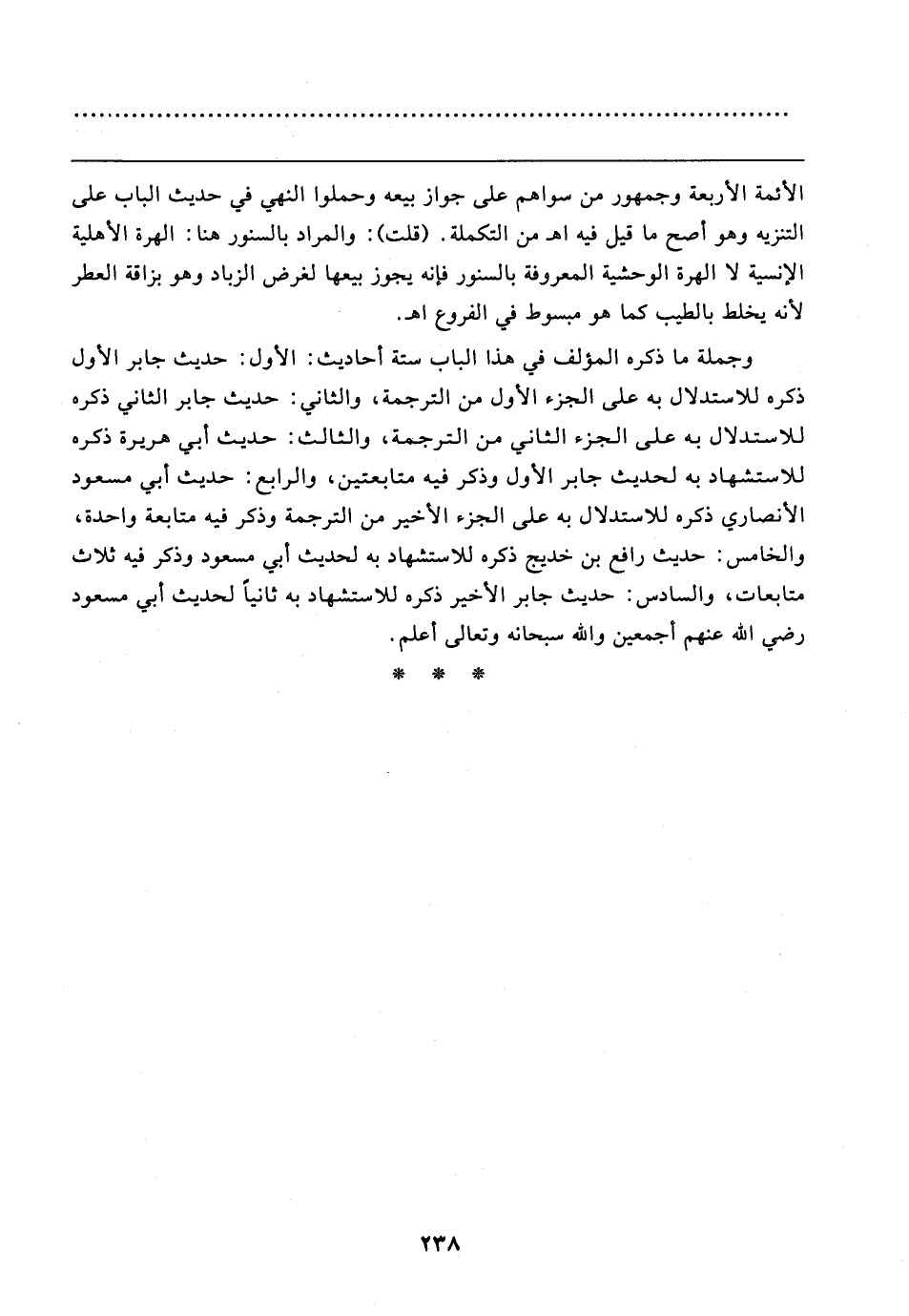 الأئمة الأربعة وجمهور من سواهم على جواز بيعه وحملوا النهي في حديث الباب على التنزيه وهو أصح ما قيل فيه اهـ من التكملة. (قلت): والمراد بالسنور هنا: الهرة الأهلية الإنسية لا الهرة الوحشية المعروفة بالسنور فإنَّه يجوز بيعها لغرض الزباد وهو بزاقة العطر لأنه يخلط بالطيب كما هو مبسوط في الفروع اهـ.