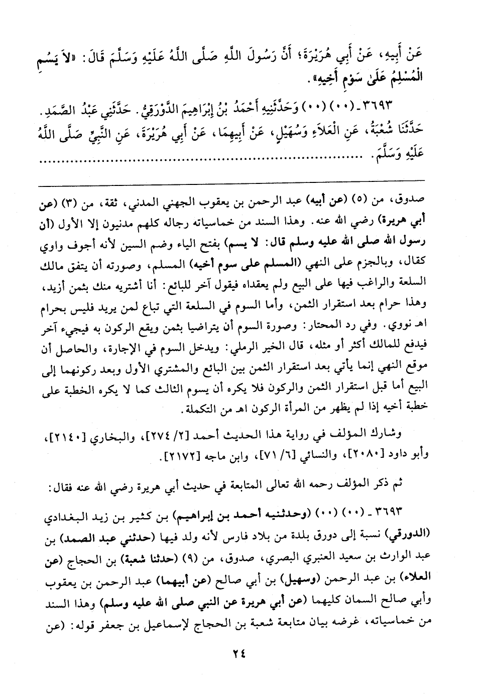 صدوق، من (٥) (عن أبيه) عبد الرحمن بن يعقوب الجهني المدني، ثقة، من (٣) (عن أبي هريرة) رضي الله عنه. وهذا السند من خماسياته رجاله كلهم مدنيون إلا الأول (أن رسول الله صلى الله عليه وسلم قال: لا يسم) بفتح الياء وضم السين لأنه أجوف واوي كقال، وبالجزم على النهي (المسلم على سوم أخيه) المسلم، وصورته أن يتفق مالك السلعة والراغب فيها على البيع ولم يعقداه فيقول آخر للبائع: أنا أشتريه منك بثمن أزيد، وهذا حرام بعد استقرار الثمن، وأما السوم في السلعة التي تباع لمن يريد فليس بحرام اهـ نووي. وفي رد المحتار: وصورة السوم أن يتراضيا بثمن ويقع الركون به فيجيء آخر فيدفع للمالك أكثر أو مثله، قال الخير الرملي: ويدخل السوم في الإجارة، والحاصل أن موقع النهي إنما يأتي بعد استقرار الثمن بين البائع والمشتري الأول وبعد ركونهما إلى البيع أما قبل استقرار الثمن والركون فلا يكره أن يسوم الثالث كما لا يكره الخطبة على خطبة أخيه إذا لم يظهر من المرأة الركون اهـ من التكملة.