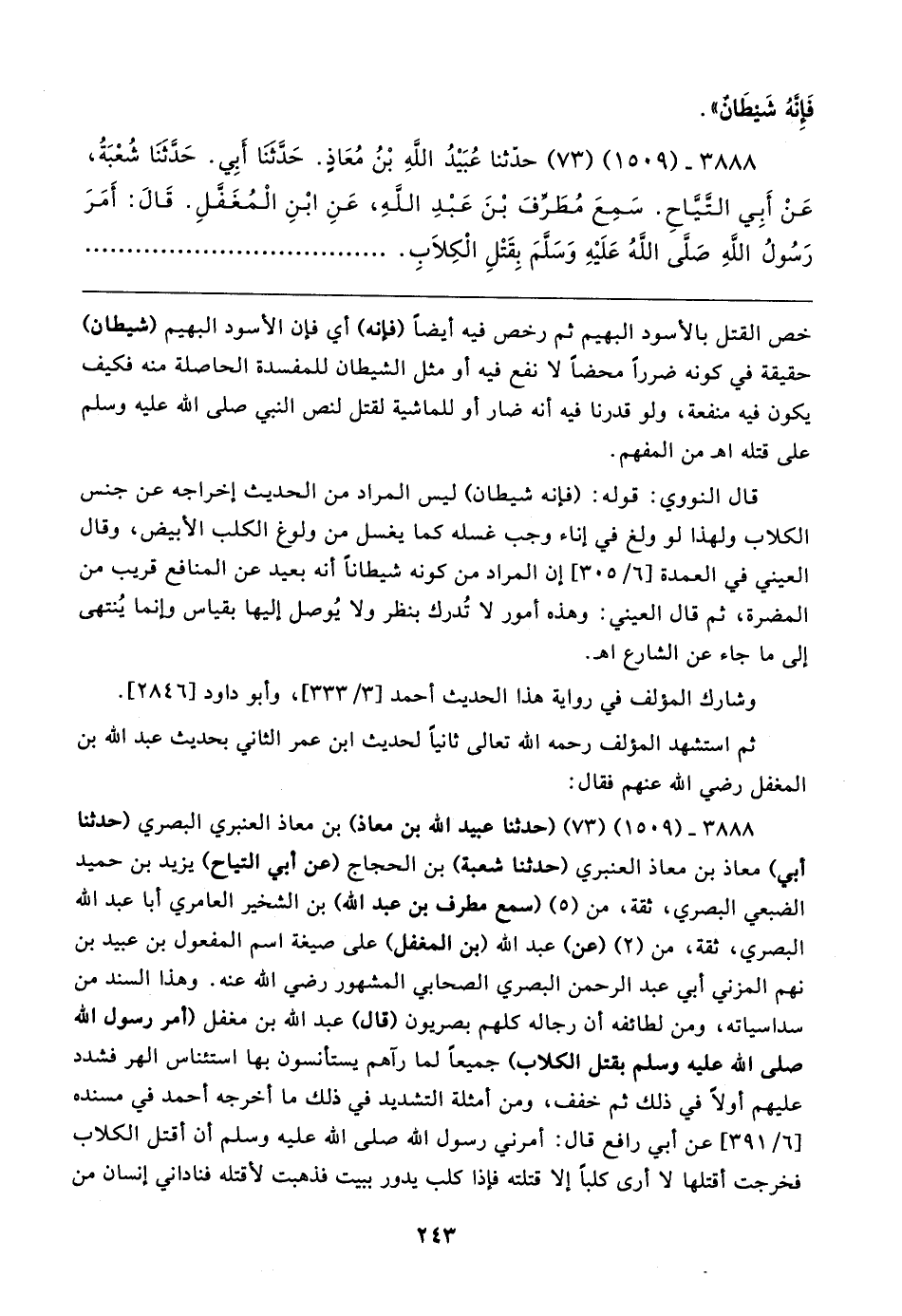 ٣٨٨٨ - (١٥٠٩) (٧٣) (حَدَّثَنَا عبيد الله بن معاذ) بن معاذ العنبري البَصْرِيّ (حَدَّثَنَا أبي) معاذ بن معاذ العنبري (حَدَّثَنَا شعبة) بن الحجاج (عن أبي التَّيَّاح) يزيد بن حميد الضبعي البَصْرِيّ، ثِقَة، من (٥) (سمع مطرف بن عبد الله) بن الشخير العامري أَبا عبد الله البَصْرِيّ، ثِقَة، من (٢) (عن) عبد الله (بن المغفل) على صيغة اسم المفعول بن عبيد بن نهم المزني أبي عبد الرَّحْمَن البَصْرِيّ الصحابي المشهور رضي الله عنه. وهذا السند من سداسياته، ومن لطائفه أن رجاله كلهم بصريون (قال) عبد الله بن مغفل (أمر رسول الله صلى الله عليه وسلم بقتل الكلاب) جميعًا لما رآهم يستأنسون بها استئناس الهر فشدد عليهم أولًا في ذلك ثم خفف، ومن أمثلة التشديد في ذلك ما أخرجه أَحْمد في مسنده [٦/ ٣٩١] عن أبي رافع قال: أمرني رسول الله صلى الله عليه وسلم أن أقتل الكلاب فخرجت أقتلها لا أرى كلبًا إلَّا قتلته فإذا كلب يدور ببيت فذهبت لأقتله فناداني إنسان من
