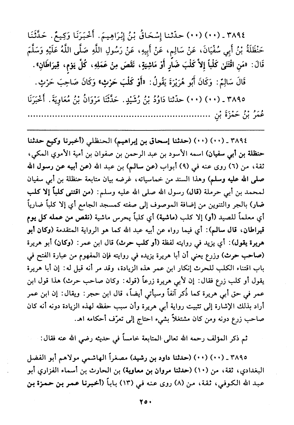 ٣٨٩٤ - (٠٠) (٠٠) حَدَّثَنَا إِسْحَاقُ بْنُ إِبْرَاهِيمَ. أخْبَرَنَا وَكِيعٌ. حَدَّثَنَا حَنْظَلَةُ بْنُ أبي سُفْيَانَ، عَنْ سَالِمٍ، عَنْ أَبِيهِ، عَنْ رَسُولِ اللهِ صَلَّى اللهُ عَلَيهِ وسلَّمَ قَال: "مَنِ اقْتَنَى كَلْبًا إلا كَلْبَ ضَارٍ أَوْ مَاشِيَةٍ، نَقَصَ مِنْ عَمَلِهِ، كُلَّ يَوْمٍ، قِيرَاطَانِ".