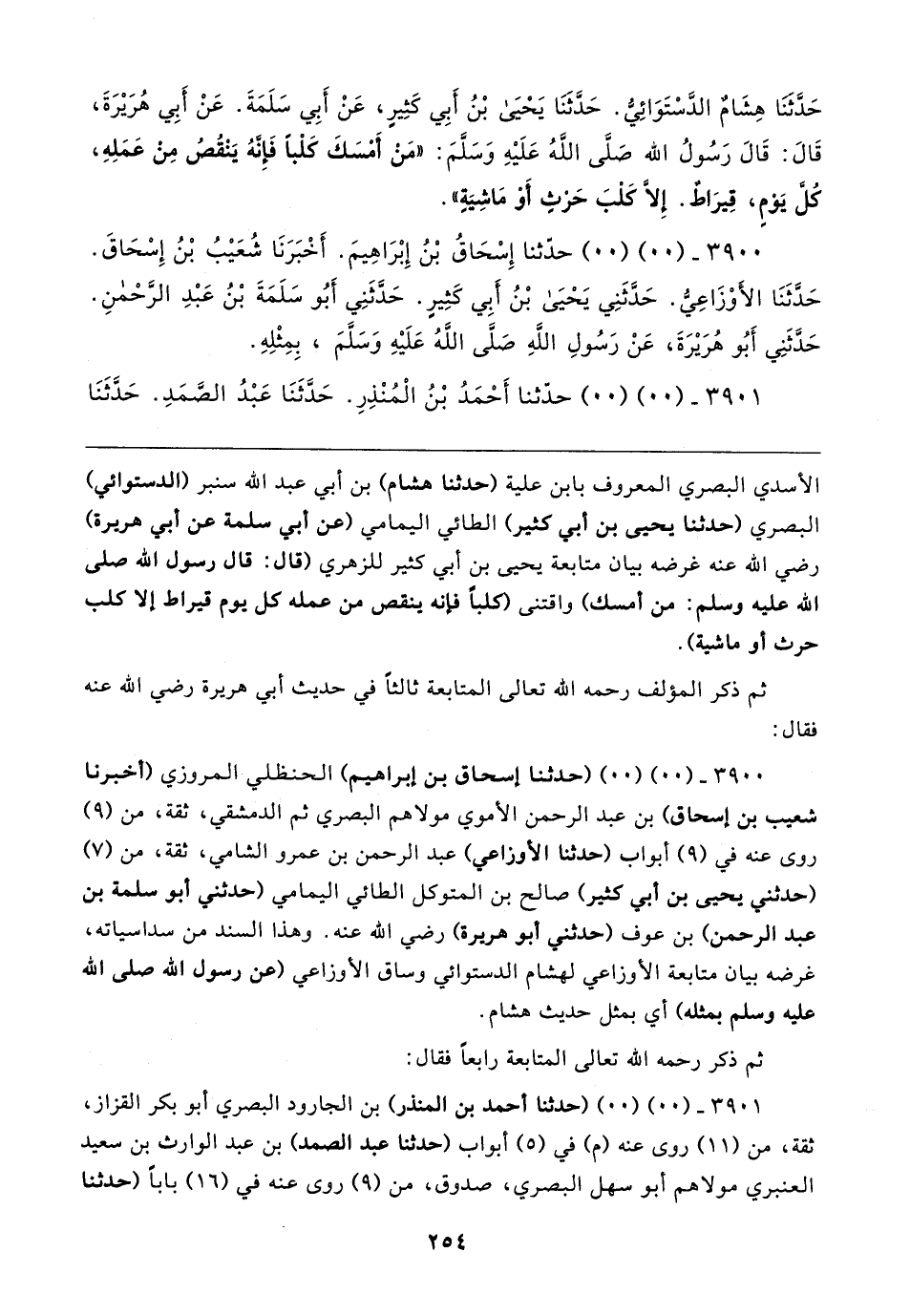 ٣٩٠٠ - (٠٠) (٠٠) (حَدَّثَنَا إسحاق بن إبراهيم) الحنظلي المروزي (أخبرنا شعيب بن إسحاق) بن عبد الرَّحْمَن الأُموي مولاهم البَصْرِيّ ثم الدِّمشقيّ، ثِقَة، من (٩) روى عنه في (٩) أبواب (حَدَّثَنَا الأَوْزَاعِيّ) عبد الرَّحْمَن بن عمرو الشَّاميّ، ثِقَة، من (٧) (حدثني يحيى بن أبي كثير) صالح بن المتوكل الطَّائيّ اليماميّ (حَدَّثني أبو سلمة بن عبد الرَّحْمَن) بن عوف (حَدَّثني أبو هريرة) رضي الله عنه. وهذا السند من سداسياته، غرضه بيان متابعة الأَوْزَاعِيّ لهشام الدستوائي وساق الأَوْزَاعِيّ (عن رسول الله صلى الله عليه وسلم بمثله) أي بمثل حديث هشام.