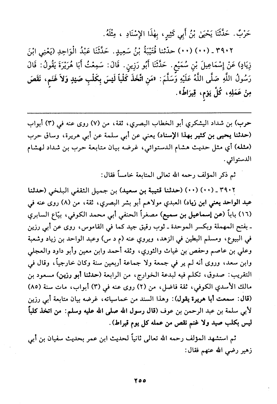 ٣٩٠٢ - (٠٠) (٠٠) حَدَّثَنَا قُتَيبَةُ بْنُ سَعِيدٍ. حَدَّثَنَا عَبْدُ الْوَاحِدِ (يَعْنِي ابْنَ زِيَادٍ) عَنْ إِسمَاعِيلَ بْنِ سُمَيعٍ. حَدَّثَنَا أبُو رَزِينٍ. قَال: سَمِعْتُ أبَا هُرَيرَةَ يَقُولُ: قَال رَسُولُ اللهِ صَلَّى اللهُ عَلَيهِ وسلَّمَ: "مَنِ اتَّخَذَ كَلْبًا لَيسَ بِكَلْبِ صَيدٍ وَلَا غَنَمٍ، نَقَصَ مِنْ عَمَلِهِ، كُلَّ يَوْمٍ، قِيرَاطٌ"
