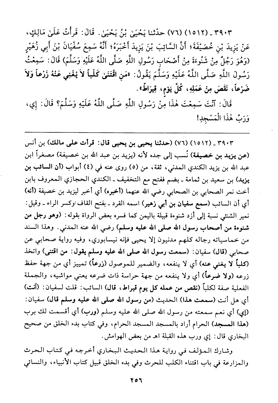 ٣٩٠٣ - (١٥١٢) (٧٦) (حَدَّثَنَا يحيى بن يحيى قال: قرأت على مالك) بن أنس (عن يزيد بن خصيفة) نُسب إلى جده لأنه (يزيد بن عبد الله بن خصيفة) مصغرًا ابن عبد الله بن يزيد الكندي المدنِيُّ، ثِقَة، من (٥) روى عنه في (٤) أبواب (أن السائب بن يزيد) بن سعيد بن ثمامة -بضم ففتح مع التخفبف- الكندي الحجازي المعروف بابن أخت نمر الصحابي بن الصحابي رضي الله عنهما (أخبره) أي أخبر ليزيد بن خصيفة (أنَّه) أي أن السائب (سمع سفيان بن أبي زهير) اسمه القرد -بفتح القاف أو كسر الراء- وقيل: نمير الشنئي نسبة إلى أزد شنوءة قبيلة باليمن كما فسره بعض الرواة بقوله: (وهو رجل من شنوءة من أصحاب رسول الله صلى الله عليه وسلم) رضي الله عنه المدنِيُّ. وهذا السند من خماسياته رجاله كلهم مدنيون إلَّا يحيى فإنَّه نيسابوري، وفيه رواية صحابي عن صحابي (قال) سفيان: (سمعت رسول الله صلى الله عليه وسلم يقول: من اقتنى) واتخذ (كلبًا لا يغني عنه) أي لا ينفعه، والضمير للموصول (زرعًا) تمييز أي من جهة حفظ زرعة (ولا ضرعًا) أي ولا ينفعه من جهة حراسة ذات ضرعه يعني مواشيه، والجملة الفعلية صفة لكلبًا (نقص من عمله كل يوم قيراط، قال) السائب: قلت لسفيان: (آنت) أي هل أَنْتَ (سمعت هذا) الحديث (من رسول الله صلى الله عليه وسلم قال) سفيان: (إي) أي نعم سمعته من رسول الله صلى الله عليه وسلم (ورب) أي أقسمت لك برب (هذا المسجد) الحرام أراد بالمسجد المسجد الحرام، وفي كتاب بدء الخلق من صحيح البُخَارِيّ قال: إي ورب هذه القبلة اهـ من بعض الهوامش.