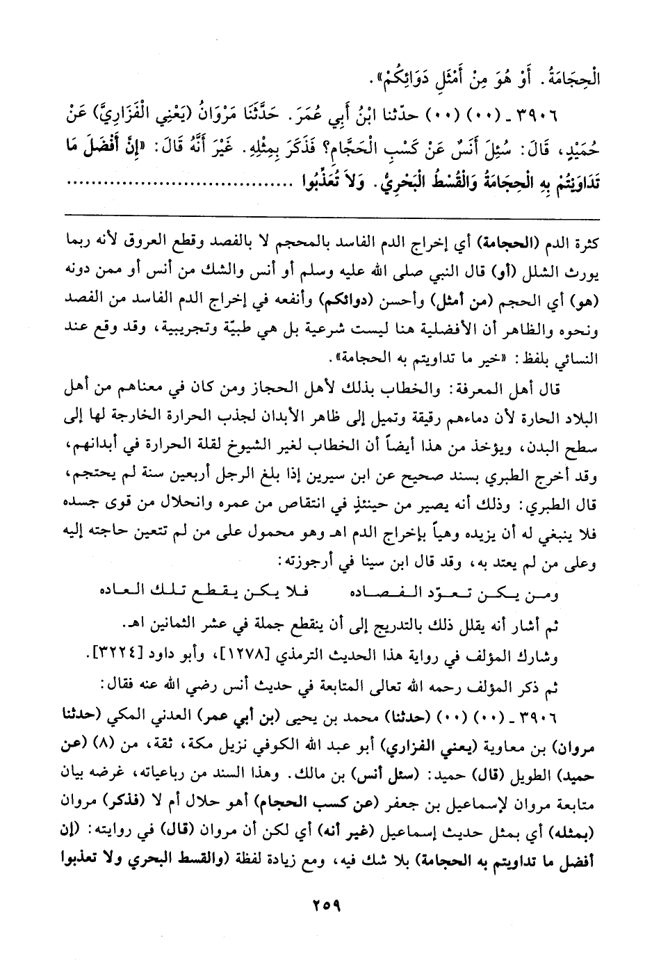٣٩٠٦ - (٠٠) (٠٠) (حدثنا) محمَّد بن يحيى (بن أبي عمر) العدني المكيّ (حَدَّثَنَا مروان) بن معاوية (يعني الفزاري) أبو عبد الله الكُوفيّ نزيل مكة، ثِقَة، من (٨) (عن حميد) الطَّويل (قال) حميد: (سئل أنس) بن مالك. وهذا السند من رباعياته، غرضه بيان متابعة مروان لإسماعيل بن جعفر (عن كسب الحجام) أهو حلال أم لا (فذكر) مروان (بمثله) أي بمثل حديث إسماعيل (غير أنَّه) أي لكن أن مروان (قال) في روايته: (أن أفضل ما تداويتم به الحجامة) بلا شك فيه، ومع زيادة لفظة (والقسط البحري ولا تعذبوا