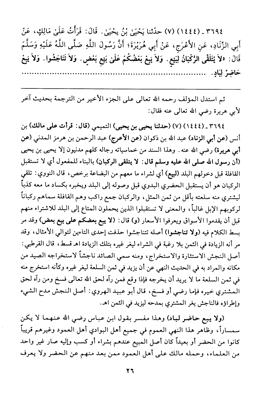 ٣٦٩٤ - (١٤٤٤) (٧) حدَّثنا يَحْيَى بْنُ يحْيَى. قَال: قَرَأْتُ عَلَى مَالِكٍ، عَنْ أَبِي الزِّنَادِ، عَنِ الأَعْرَجِ، عَنْ أَبِي هُرَيرَةَ؛ أَنَّ رَسُولَ اللهِ صَلَّى اللهُ عَلَيهِ وَسَلَّمَ قَال: "لَا يُتَلَقَّى الرُّكْبَانُ لِبَيعٍ. وَلَا يَبعْ بَعْضُكُمْ عَلَى بَيعِ بَعْضٍ. وَلَا تَنَاجَشُوا. وَلَا يَبعْ حَاضِرٌ لِبَادٍ