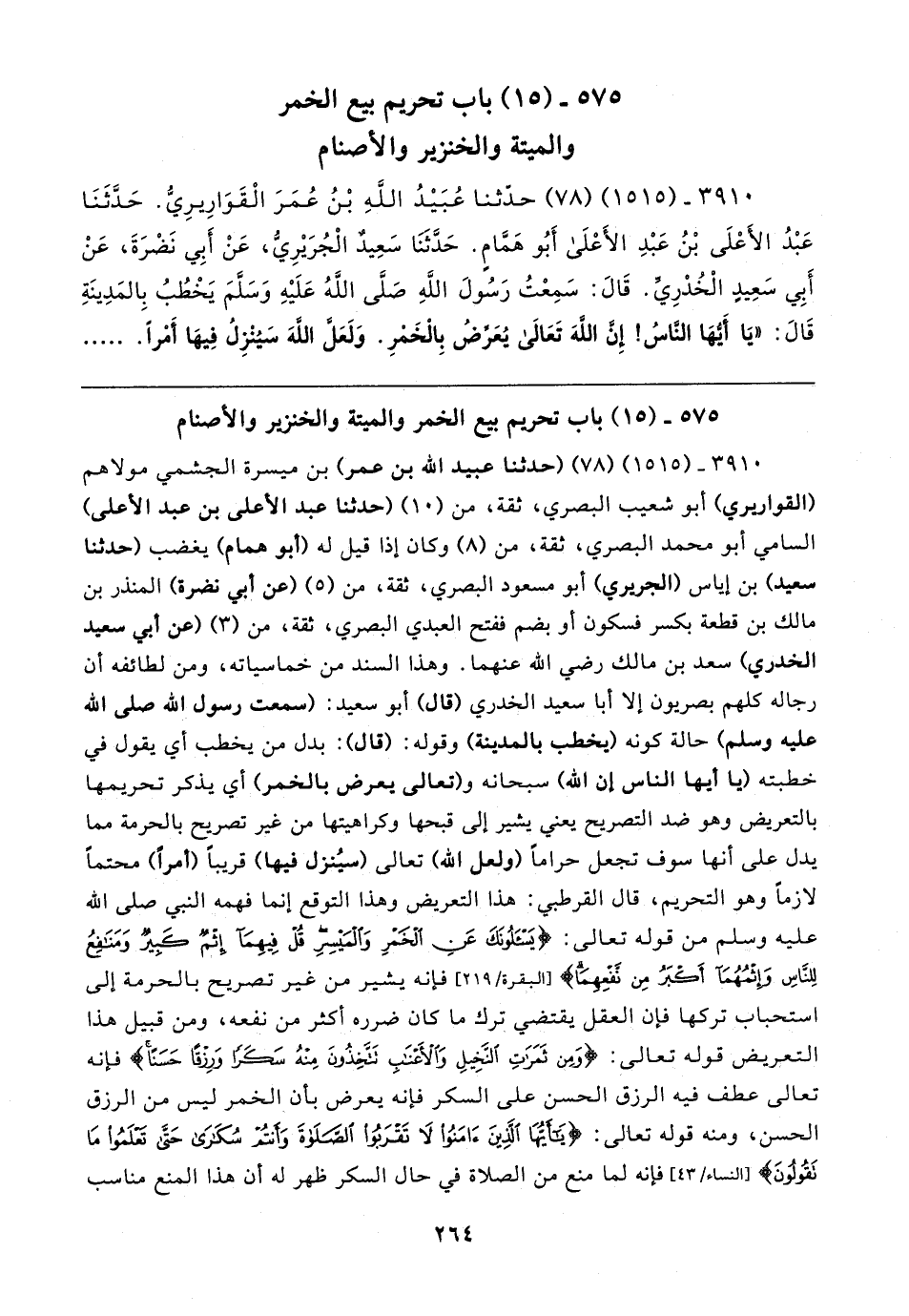 ٣٩١٠ - (١٥١٥) (٧٨) (حَدَّثَنَا عبيد الله بن عمر) بن ميسرة الجشمي مولاهم (القواريري) أبو شعيب البَصْرِيّ، ثِقَة، من (١٠) (حَدَّثَنَا عبد الأعلى بن عبد الأعلى) السامي أبو محمَّد البَصْرِيّ، ثِقَة، من (٨) وكان إذا قيل له (أبو همام) يغضب (حَدَّثَنَا سعيد) بن إياس (الجريري) أبو مسعود البَصْرِيّ، ثِقَة، من (٥) (عن أبي نضرة) المنذر بن مالك بن قطعة بكسر فسكون أو بضم ففتح العبدي البَصْرِيّ، ثِقَة، من (٣) (عن أبي سعيد الخُدرِيّ) سعد بن مالك رضي الله عنهما. وهذا السند من خماسياته، ومن لطائفه أن رجاله كلهم بصريون إلَّا أَبا سعيد الخُدرِيّ (قال) أبو سعيد: (سمعت رسول الله صلى الله عليه وسلم) حاله كونه (يخطب بالمدينة) وقوله: (قال): بدل من يخطب أي يقول في خطبته (يَا أيها النَّاس أن الله) سبحانه و (تعالى يعرض بالخمر) أي يذكر تحريمها بالتعريض وهو ضد التصريح يعني يشير إلى قبحها وكراهيتها من غير تصريح بالحرمة مما يدل على أنها سوف تجعل حرامًا (ولعل الله) تعالى (سيُنزل فيها) قريبًا (أمرًا) محتمًا لازمًا وهو التحريم، قال القرطبي: هذا التعريض وهذا التوقع إنما فهمه النَّبِيّ صلى الله عليه وسلم من قوله تعالى: {يَسْأَلُونَكَ عَنِ الْخَمْرِ وَالْمَيسِرِ قُلْ فِيهِمَا إِثْمٌ كَبِيرٌ وَمَنَافِعُ لِلنَّاسِ وَإِثْمُهُمَا أَكْبَرُ مِنْ نَفْعِهِمَا} [البقرة / ٢١٩] فإنَّه يشير من غير تصريح بالحرمة إلى استحباب تركها فإن العقل يقتضي ترك ما كان ضرره أكثر من نفعه، ومن قبيل هذا التعريض قوله تعالى: {وَمِنْ ثَمَرَاتِ النَّخِيلِ وَالْأَعْنَابِ تَتَّخِذُونَ مِنْهُ سَكَرًا وَرِزْقًا حَسَنًا} فإنَّه تعالى عطف فيه الرزق الحسن على السكر فإنَّه يعرض بأن الخمر ليس من الرزق الحسن، ومنه قوله تعالى: {يَا أَيُّهَا الَّذِينَ آمَنُوا لَا تَقْرَبُوا الصَّلَاةَ وَأَنْتُمْ سُكَارَى حَتَّى تَعْلَمُوا مَا تَقُولُونَ} [النساء / ٤٣] فإنَّه لما منع من الصلاة في حال السكر ظهر له أن هذا المنع مناسب
