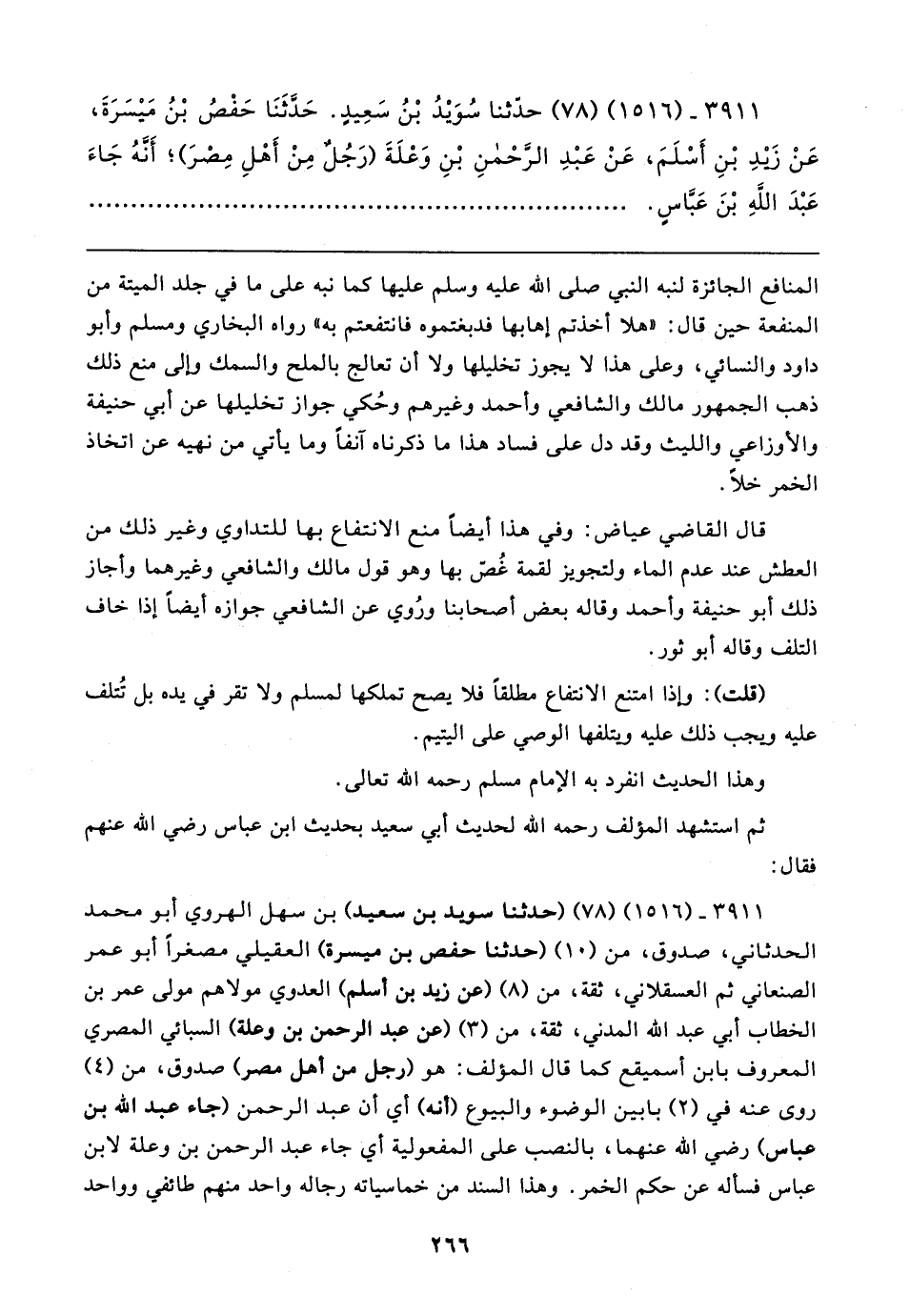 ٣٩١١ - (١٥١٦) (٧٨) حدثنا سُوَيدُ بْنُ سَعِيدٍ. حَدَّثَنَا حَفْصُ بْنُ مَيسَرَةَ، عَنْ زيدِ بْنِ أَسْلَمَ، عَنْ عَبْدِ الرَّحْمنِ بْنِ وَعْلَةَ (رَجُلٌ مِنْ أَهْلِ مِصْرَ)؛ أَنَّهُ جَاءَ عَبْدَ اللهِ بْنَ عَبَّاسٍ