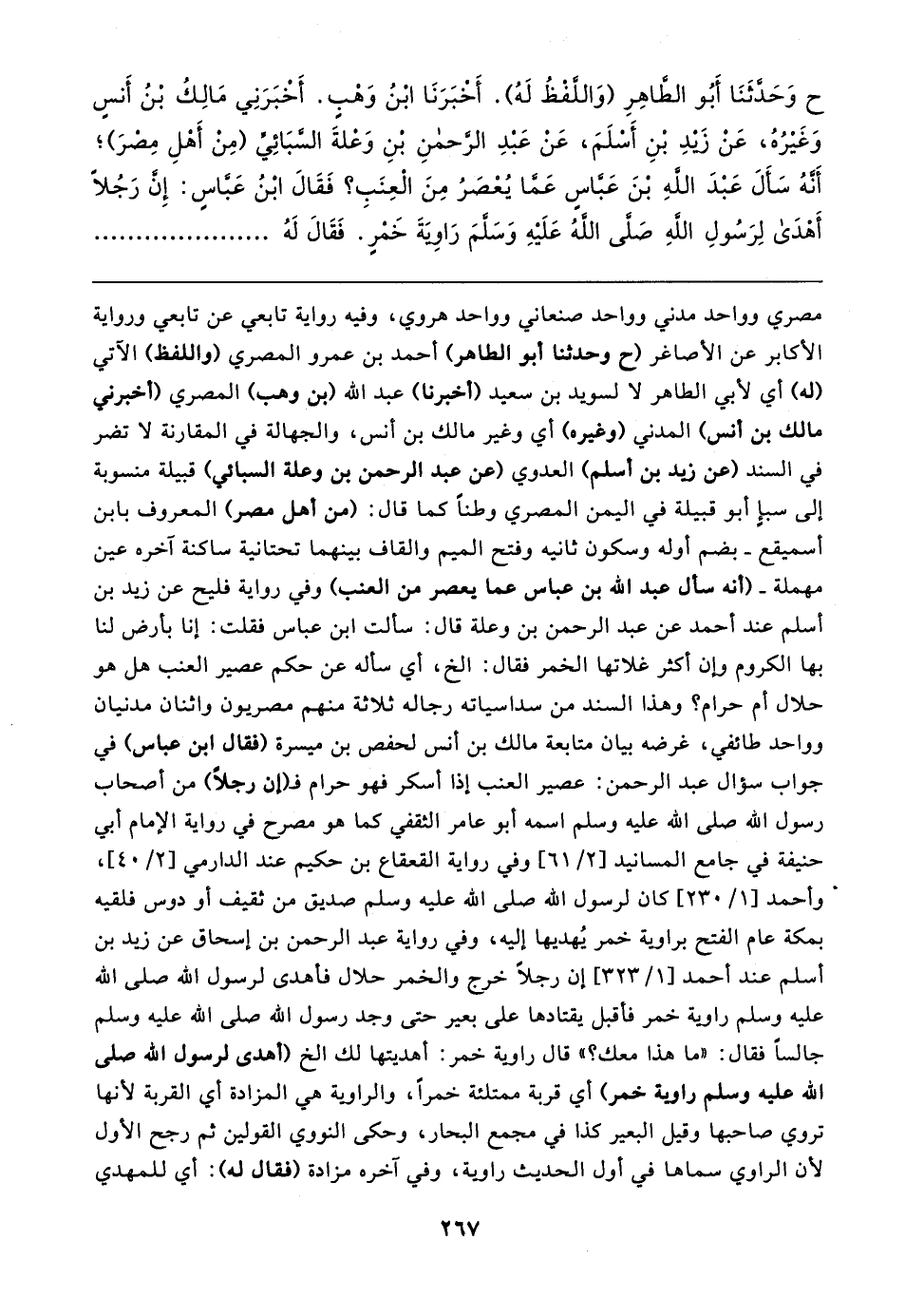 ح وَحَدَّثَنَا أَبُو الطَّاهِرِ (وَاللَّفْظُ لَهُ). أَخبَرَنَا ابْنُ وَهْبٍ. أَخْبَرَنِي مَالِكُ بْنُ أَنسٍ وَغَيرُهُ، عَنْ زَيدِ بْنِ أَسْلَمَ، عَنْ عَبْدِ الرَّحمنِ بْنِ وَغلةَ السَّبَائِيِّ (من أَهْلِ مِصْرَ)؛ أَنَّهُ سَأَلَ عَبْدَ اللهِ بْنَ عَبَّاسٍ عَمَّا يُعْصَرُ مِنَ الْعِنَبِ؟ فَقَال ابْنُ عَبَّاسِ: إِنَّ رَجُلًا أَهْدَى لِرَسُولِ اللهِ صلى الله عَلَيهِ وَسلَّمَ رَاويةَ خَمْرٍ. فَقَال لَهُ