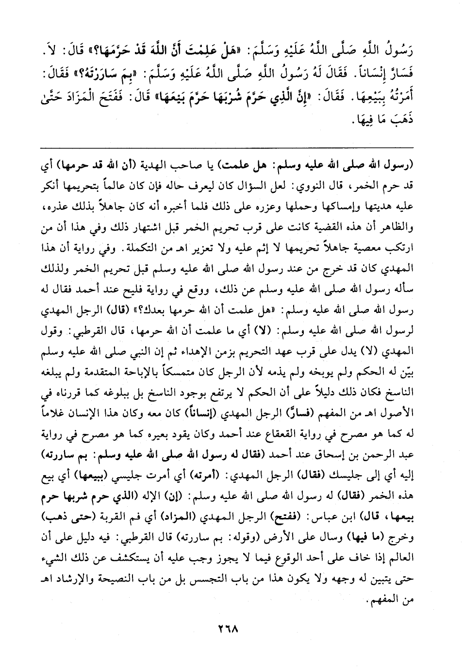 رَسُولُ اللهِ صَلَّى الله عَلَيهِ وَسَلَّمَ: "هَلْ عَلِمْتَ أَنَّ الله قَدْ حَرَّمَهَا؟ " قَال: لا. فَسَارَّ إِنْسَانًا. فَقَال لَهُ رَسُولُ اللهِ صَلَّى الله عَلَيهِ وَسلَّمَ: "بِمَ سَارَرْتَهُ؟ "فَقَال: أَمَرْتُهُ بِبَيعِهَا. فَقَال: "إِنَّ الَّذِي حَرَّمَ شُرْبَهَا حَرَّمَ بَيعَهَا" قَال: فَفَتَحَ الْمَزَادَ حَتَّى ذَهَبَ مَا فِيهَا