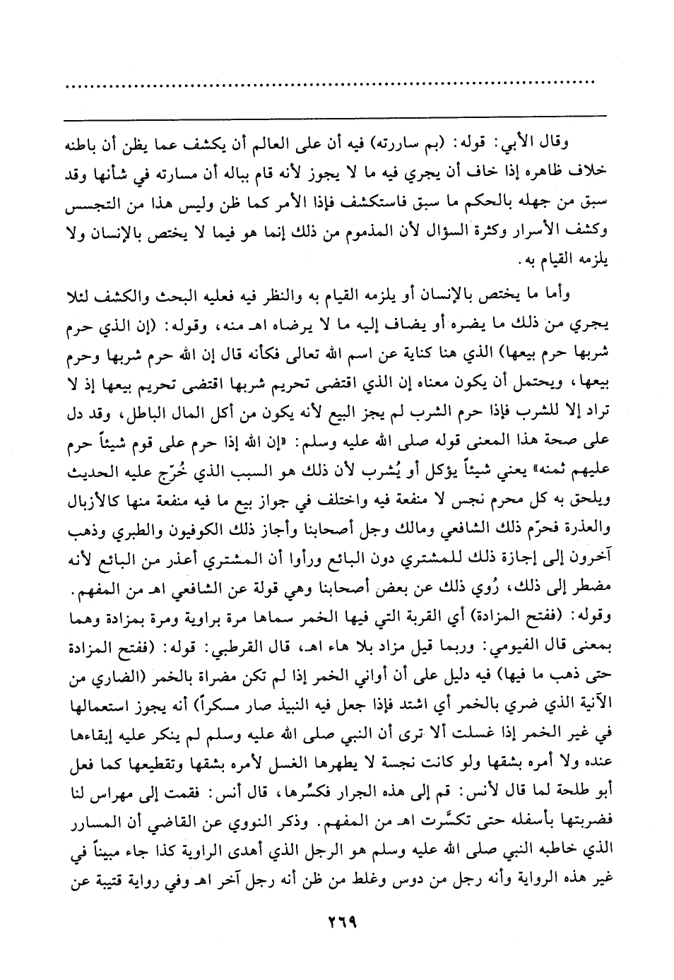 وأما ما يختص بالإنسان أو يلزمه القيام به والنظر فيه فعليه البحث والكشف لئلا يجري من ذلك ما يضره أو يضاف إليه ما لا يرضاه اهـ منه، وقوله: (إن الذي حرم شربها حرم بيعها) الذي هنا كناية عن اسم الله تعالى فكأنه قال إن الله حرم شربها وحرم بيعها، ويحتمل أن يكون معناه إن الذي اقتضى تحريم شربها اقتضى تحريم بيعها إذ لا تراد إلا للشرب فإذا حرم الشرب لم يجز البيع لأنه يكون من أكل المال الباطل، وقد دل على صحة هذا المعنى قوله صلى الله عليه وسلم: "إن الله إذا حرم على قوم شيئًا حرم عليهم ثمنه" يعني شيئًا يؤكل أو يُشرب لأن ذلك هو السبب الذي خُرّج عليه الحديث ويلحق به كل محرم نجس لا منفعة فيه واختلف في جواز بيع ما فيه منفعة منها كالأزبال والعذرة فحرّم ذلك الشَّافعيّ ومالك وجل أصحابنا وأجاز ذلك الكوفيون والطبري وذهب آخرون إلى إجازة ذلك للمشتري دون البائع ورأوا أن المشتري أعذر من البائع لأنه مضطر إلى ذلك، رُوي ذلك عن بعض أصحابنا وهي قولة عن الشَّافعيّ اهـ من المفهم. وقوله: (ففتح المزادة) أي القربة التي فيها الخمر سماها مرة براوية ومرة بمزادة وهما بمعنى قال الفيومي: وربما قيل مزاد بلا هاء اهـ، قال القرطبي: قوله: (ففتح المزادة حتَّى ذهب ما فيها) فيه دليل على أن أواني الخمر إذا لم تكن مضراة بالخمر (الضاري من الآنية الذي ضري بالخمر أي اشتد فإذا جعل فيه النبيذ صار مسكرًا) أنَّه يجوز استعمالها في غير الخمر إذا غسلت ألا ترى أن النَّبِيّ صلى الله عليه وسلم لم ينكر عليه إبقاءها عنده ولا أمره بشقها ولو كانت نجسة لا يطهرها الغسل لأمره بشقها وتقطيعها كما فعل أبو طلحة لما قال لأنس: قم إلى هذه الجرار فكسِّرها، قال أنس: فقمت إلى مهراس لنا فضربتها بأسفله حتَّى تكسَّرت اهـ من المفهم. وذكر النووي عن القاضي أن المسارر الذي خاطبه النَّبِيّ صلى الله عليه وسلم هو الرَّجل الذي أهدى الراوية كذا جاء مبينًا في غير هذه الرواية وأنه رجل من دوس وغلط من ظن أنَّه رجل آخر اهـ وفي رواية قتيبة عن