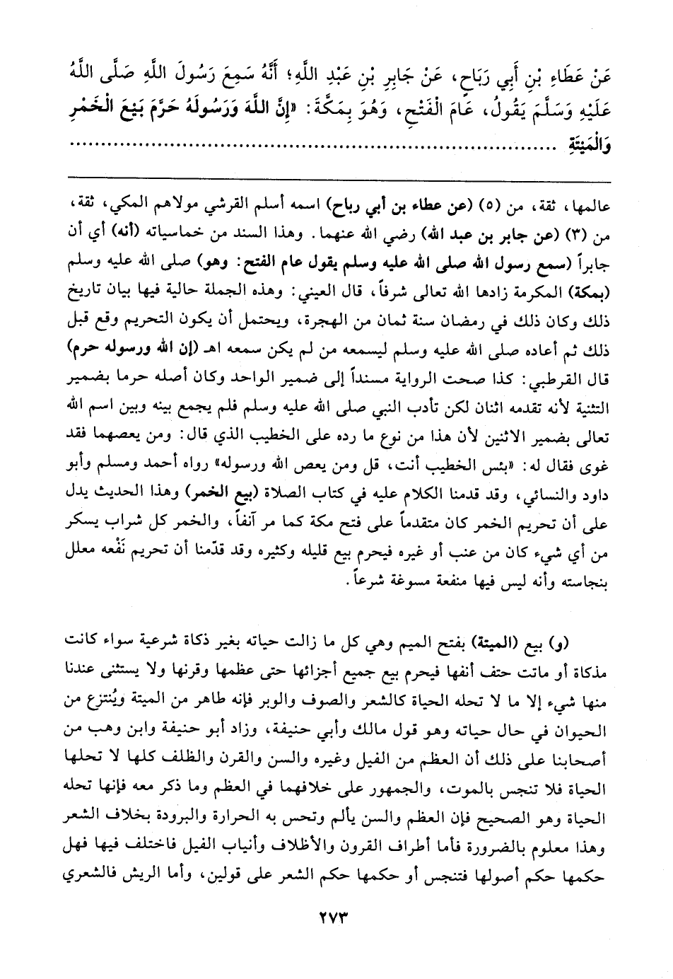 عَنْ عَطَاءِ بْنِ أَبِي رَبَاحٍ، عَن جَابِرِ بنِ عَبْدِ اللهِ؛ أَنَّهُ سَمِعَ رَسُولَ اللهِ صَلى اللهُ عَلَيهِ وَسَلمَ يَقُولُ، عَامَ الْفَتْحِ، وَهُوَ بِمَكةَ: "إِن اللهَ وَرَسُولَهُ حَرَّمَ بَيعَ الْخَمْرِ وَالمَيتَةِ