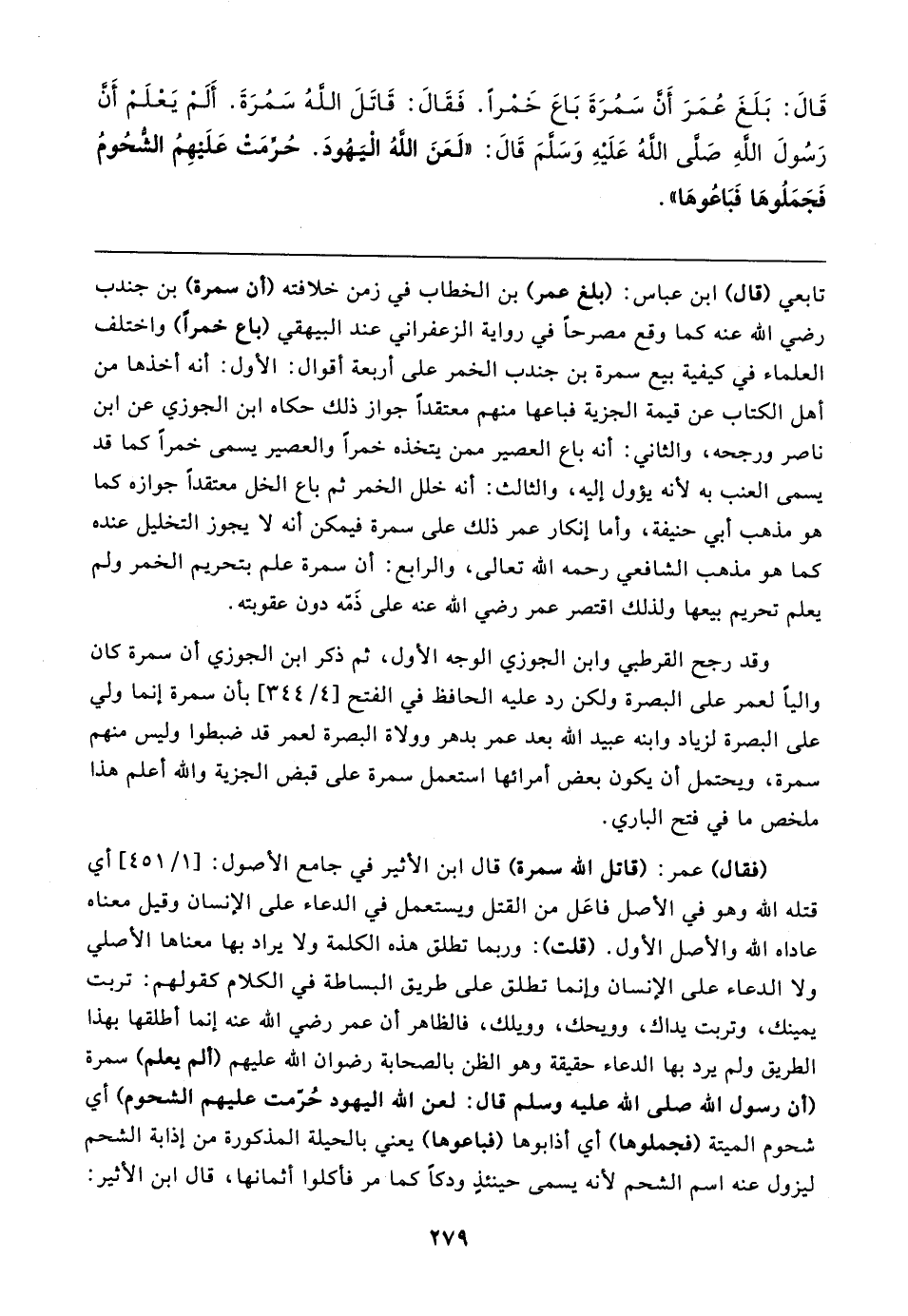 قَال: بَلَغَ عُمَرَ أَن سَمُرَةَ بَاعَ خَمْرًا. فَقَال: قَاتَلَ اللهُ سَمُرَةَ. ألَمْ يَعْلَمْ أَن رَسُولَ اللهِ صَلى اللهُ عَلَيهِ وَسَلمَ قَال: "لَعَنَ اللهُ الْيَهُودَ. حُرِّمَت عَلَيهِمُ الشحُومُ فَجَمَلُوهَا فَبَاعُوهَا"