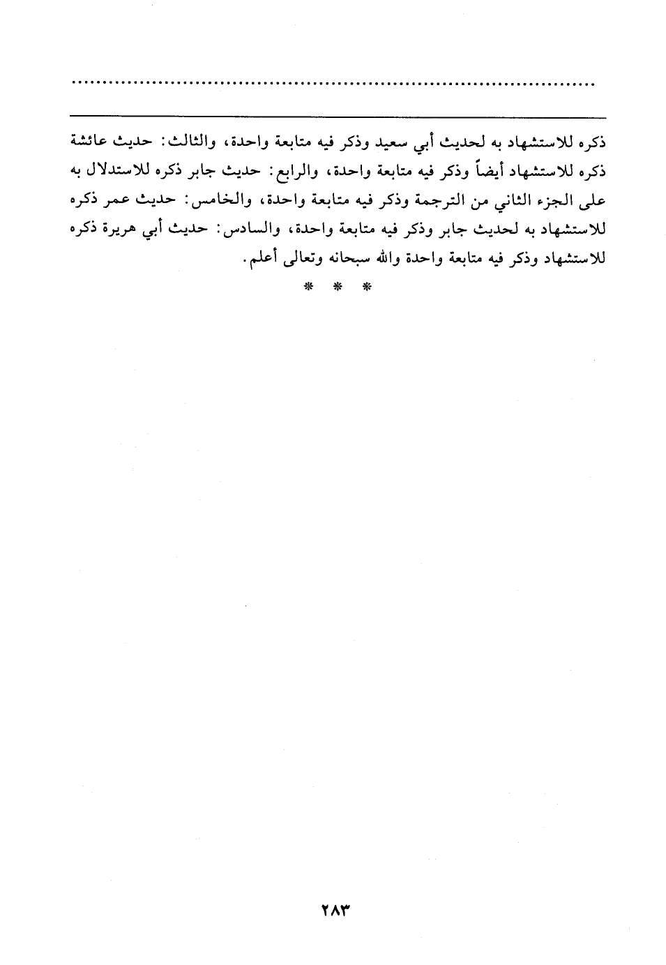 ذكره للاستشهاد به لحديث أبي سعيد وذكر فيه متابعة واحدة، والثالث: حديث عائشة ذكره للاستشهاد أيضًا وذكر فيه متابعة واحدة، والرابع: حديث جابر ذكره للاستدلال به على الجزء الثاني من الترجمة وذكر فيه متابعة واحدة، والخامس: حديث عمر ذكره للاستشهاد به لحديث جابر وذكر فيه متابعة واحدة، والسادس: حديث أبي هريرة ذكره للاستشهاد وذكر فيه متابعة واحدة والله سبحانه وتعالى أعلم.