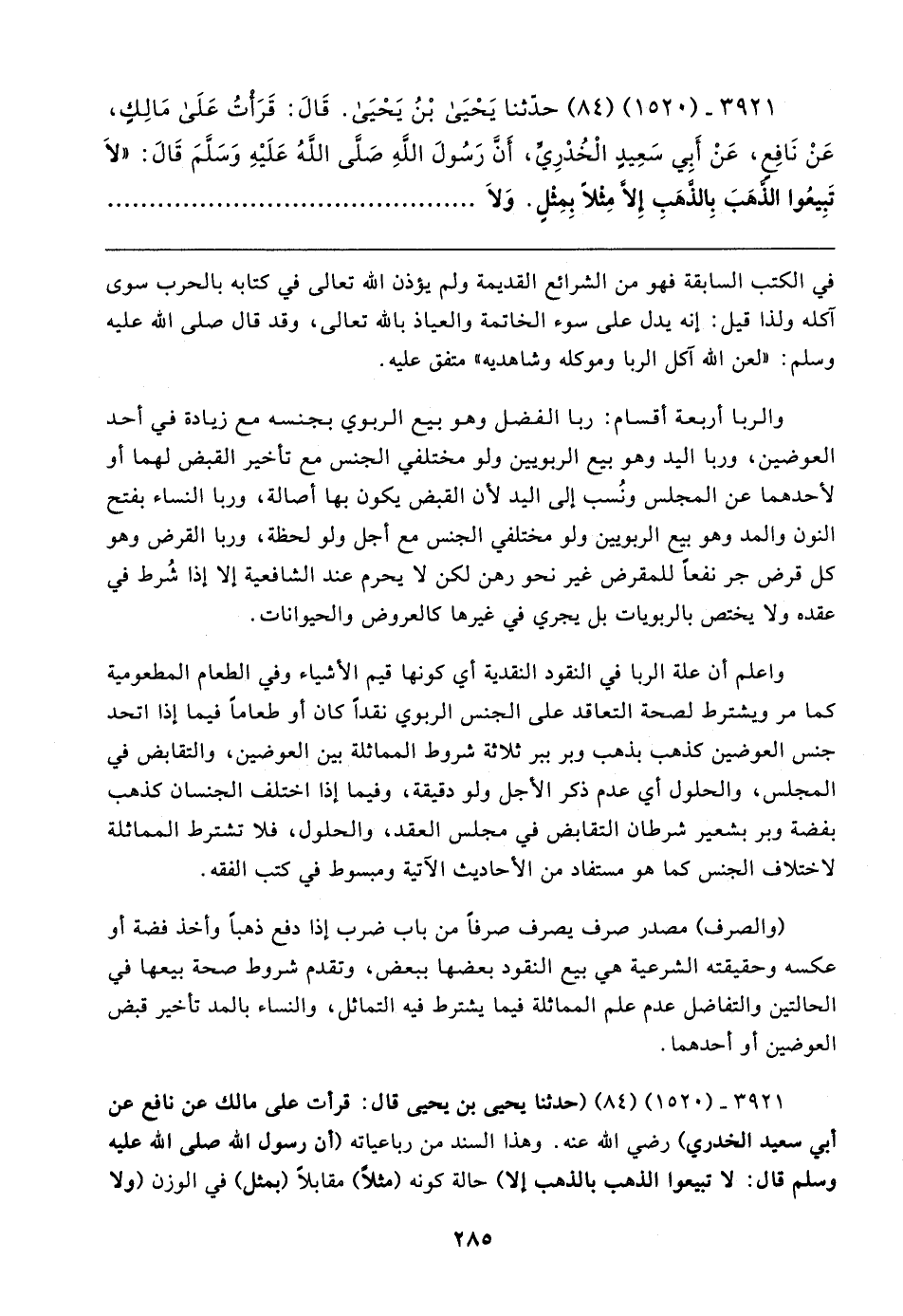 ٣٩٢١ - (١٥٢٠) (٨٤) (حدثنا يحيى بن يحيى قال قرأت على مالك عن نافع عن أبي سعيد الخدري) رضي الله عنه. وهذا السند من رباعياته (أن رسول الله صلى الله عليه وسلم قال: لا تبيعوا الذهب بالذهب إلا) حالة كونه (مثلًا) مقابلا (بمثل) في الوزن (ولا