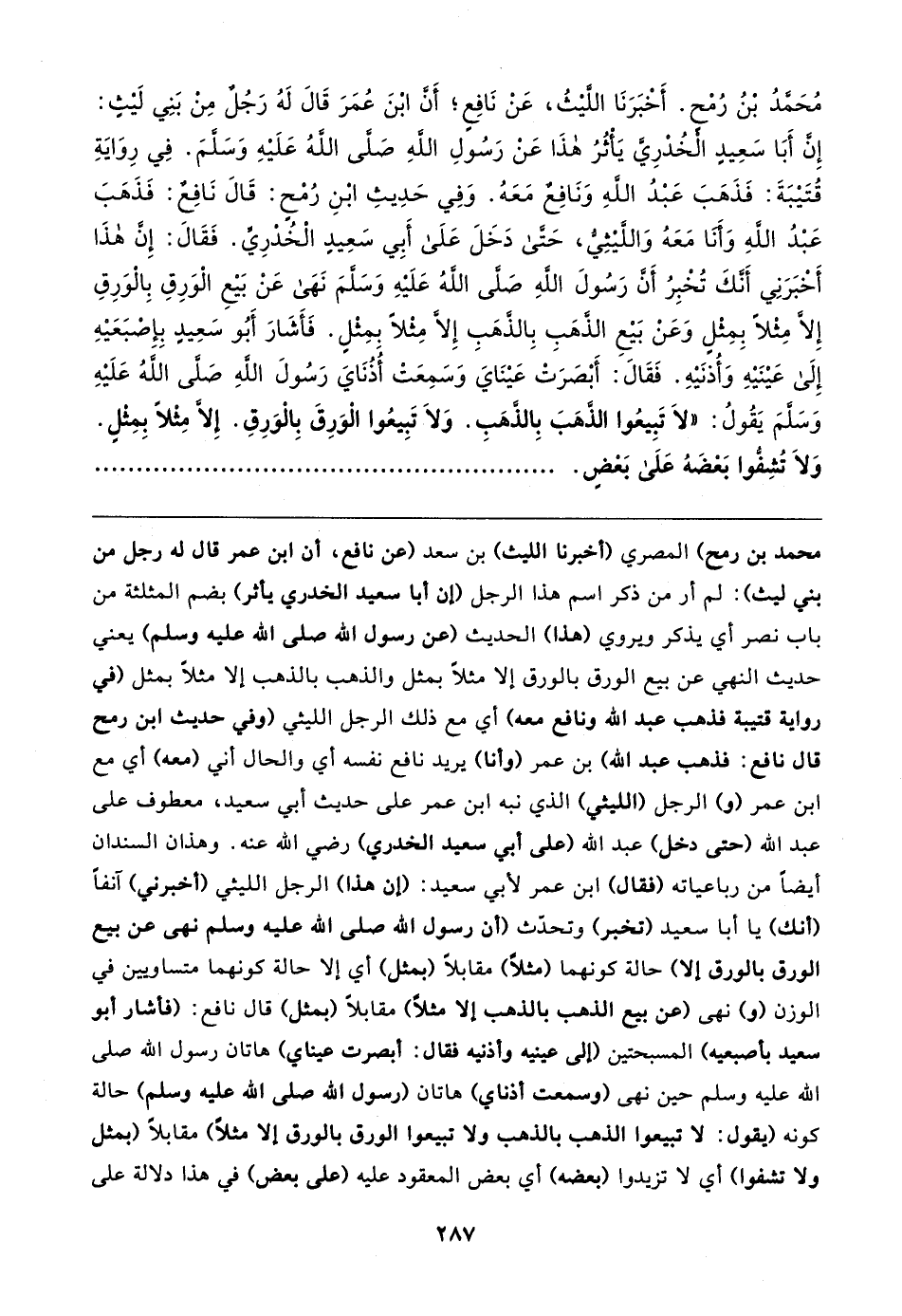 مُحَمَّدُ بن رُمْح. أخْبَرَنَا الليثُ، عَنْ نَافِع؛ أَن ابنَ عُمَرَ قَال لَهُ رَجُل مِن بَنِي لَيث: إِنَّ أَبَا سَعِيد الخُدْرِي يَأثُرُ هذَا عَنْ رَسُولِ اللهِ صَلى اللهُ عَلَيهِ وَسَلمَ. فِي رِوَايَةِ قُتَيبَةَ: فَذَهَبَ عَبْدُ اللهِ وَنَافِعٌ معَهُ. وَفِي حَدِيثِ ابنِ رُمْح: قَال نَافِعٌ: فَذَهَبَ عَبْدُ اللهِ وَأَنا مَعَهُ وَاللَّيثِي، حَتى دَخَلَ عَلَى أَبِي سَعِيدٍ الْخُدرِي. فَقَال: إِنَّ هذَا أَخْبَرَنِي أنَّكَ تُخْبِرُ أَن رَسُولَ اللهِ صَلى اللهُ عَلَيهِ وَسَلمَ نَهَى عَنْ بَيعِ الْوَرِقِ بِالوَرِقِ إِلا مِثْلًا بِمِثْل وَعَنْ بَيعِ الذهَبِ بِالذهَبِ إِلا مِثْلًا بِمِثْلٍ. فَأَشَارَ أَبُو سَعِيد بِإصْبَعَيهِ إِلَى عَينَيهِ وَأُذنَيهِ. فَقَال: أَبْصَرَتْ عَينَايَ وَسَمِعَتْ أذُنَايَ رَسُولَ اللهِ صَلى اللَّهُ عَلَيهِ وَسَلمَ يَقُولُ: "لَا تَبِيعُوا الذَّهَبَ بِالذَّهَبِ. وَلَا تَبِيعُوا الْوَرِقَ بِالْوَرِقِ. إِلا مِثْلًا بِمِثلٍ. وَلَا تُشِفُّوا بَعْضَهُ عَلَي بَعْضٍ