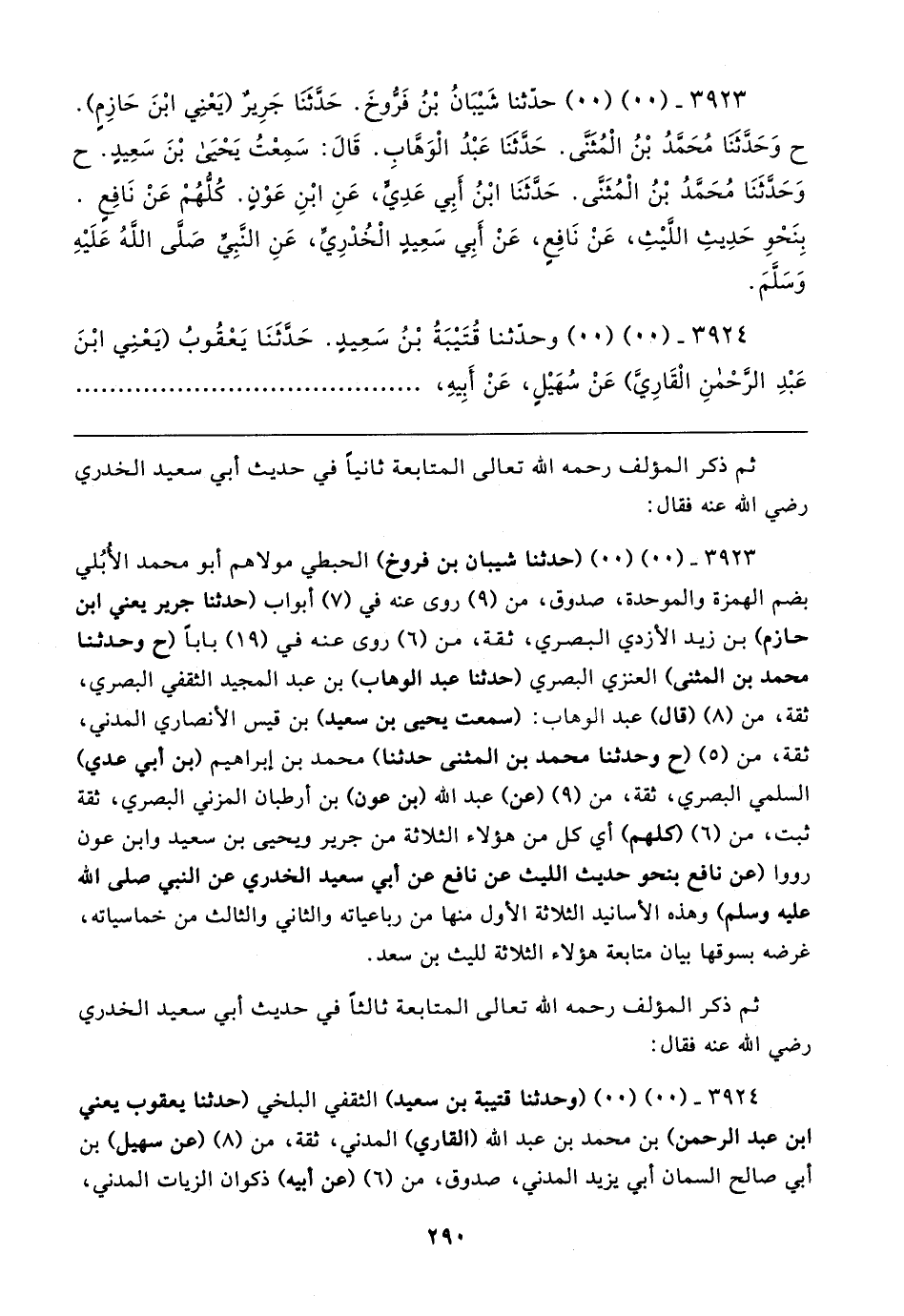 ٣٩٢٣ - (٠٠) (٠٠) (حدثنا شيبان بن فروخ) الحبطي مولاهم أبو محمد الأبُلي بضم الهمزة والموحدة، صدوق، من (٩) روى عنه في (٧) أبواب (حدثنا جرير يعني ابن حازم) بن زيد الأزدي البصري، ثقة، من (٦) روى عنه في (١٩) بابا (ح وحدثنا محمد بن المثنى) العنزي البصري (حدثنا عبد الوهاب) بن عبد المجيد الثقفي البصري، ثقة، من (٨) (قال) عبد الوهاب: (سمعت يحيى بن سعيد) بن قيس الأنصاري المدني، ثقة، من (٥) (ح وحدثنا محمد بن المثنى حدثنا) محمد بن إبراهيم (بن أبي عدي) السلمي البصري، ثقة، من (٩) (عن) عبد الله (بن عون) بن أرطبان المزني البصري، ثقة ثبت، من (٦) كلهم) أي كل من هؤلاء الثلاثة من جرير ويحيى بن سعيد وابن عون رووا (عن نافع بنحو حديث الليث عن نافع عن أبي سعيد الخدري عن النبي صلى الله عليه وسلم) وهذه الأسانيد الثلاثة الأول منها من رباعياته والثاني والثالث من خماسياته، غرضه بسوقها بيان متابعة هؤلاء الثلاثة لليث بن سعد.