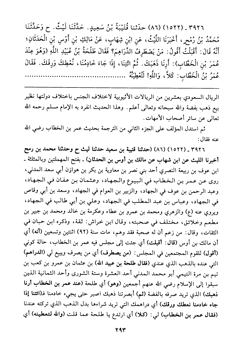 ٣٩٢٦ - (١٥٢٢) (٨٦) حدثنا قُتَيبَةُ بْنُ سَعِيدٍ. حَدَّثَنَا لَيثٌ. ح وَحَدثَنَا مُحَمَّدُ بْنُ رُمْحٍ، أَخْبَرَنَا اللّيثُ، عَنِ ابْنِ شِهَابٍ، عَنْ مَالِكِ بْنِ أَوْسِ بْنِ الْحَدَثَانِ؛ أَنهُ قَال: أَقْبَلْتُ أقُولُ: مَن يَصْطَرِفُ الدرَاهِمَ؟ فَقَال طَلْحَةُ بْنُ عُبَيدِ اللهِ (وَهُوَ عِنْدَ عُمَرَ بْنِ الْخَطَّابِ): أَرِنَا ذَهَبَكَ. ثُم ائتِنَا، إِذَا جَاءَ خَادِمُنَا، نُعْطِكَ وَرِقَكَ. فَقَال عُمَرُ بْنُ الْخَطَّابِ: كَلَّا، وَاللَهِ! لَتُعْطِيَنَّهُ
