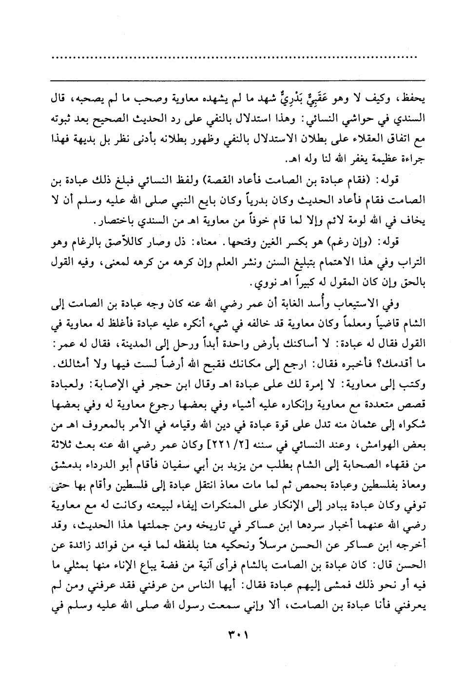 وفي الاستيعاب وأُسد الغابة أن عمر رضي الله عنه كان وجه عبادة بن الصامت إلى الشام قاضيًا ومعلمًا وكان معاوية قد خالفه في شيء أنكره عليه عبادة فأغلظ له معاوية في القول فقال له عبادة: لا أساكنك بأرض واحدة أبدًا ورحل إلى المدينة، فقال له عمر: ما أقدمك؟ فأخبره فقال: ارجع إلى مكانك فقبح الله أرضًا لست فيها ولا أمثالك. وكتب إلى معاوية: لا إمرة لك على عبادة اهـ وقال ابن حجر في الإصابة: ولعبادة قصص متعددة مع معاوية وإنكاره عليه أشياء وفي بعضها رجوع معاوية له وفي بعضها شكواه إلى عثمان منه تدل على قوة عبادة في دين الله وقيامه في الأمر بالمعروف اهـ من بعض الهوامش، وعند النسائي في سننه [٢/ ٢٢١] وكان عمر رضي الله عنه بعث ثلاثة من فقهاء الصحابة إلى الشام بطلب من يزيد بن أبي سفيان فأقام أبو الدرداء بدمشق ومعاذ بفلسطين وعبادة بحمص ثم لما مات معاذ انتقل عبادة إلى فلسطين وأقام بها حتى توفي وكان عبادة يبادر إلى الإنكار على المنكرات إيفاء لبيعته وكانت له مع معاوية رضي الله عنهما أخبار سردها ابن عساكر في تاريخه ومن جملتها هذا الحديث، وقد أخرجه ابن عساكر عن الحسن مرسلًا ونحكيه هنا بلفظه لما فيه من فوائد زائدة عن الحسن قال: كان عبادة بن الصامت بالشام فرأى آنية من فضة يباع الإناء منها بمثلي ما فيه أو نحو ذلك فمشى إليهم عبادة فقال: أيها الناس من عرفني فقد عرفني ومن لم يعرفني فأنا عبادة بن الصامت، ألا وإني سمعت رسول الله صلى الله عليه وسلم في