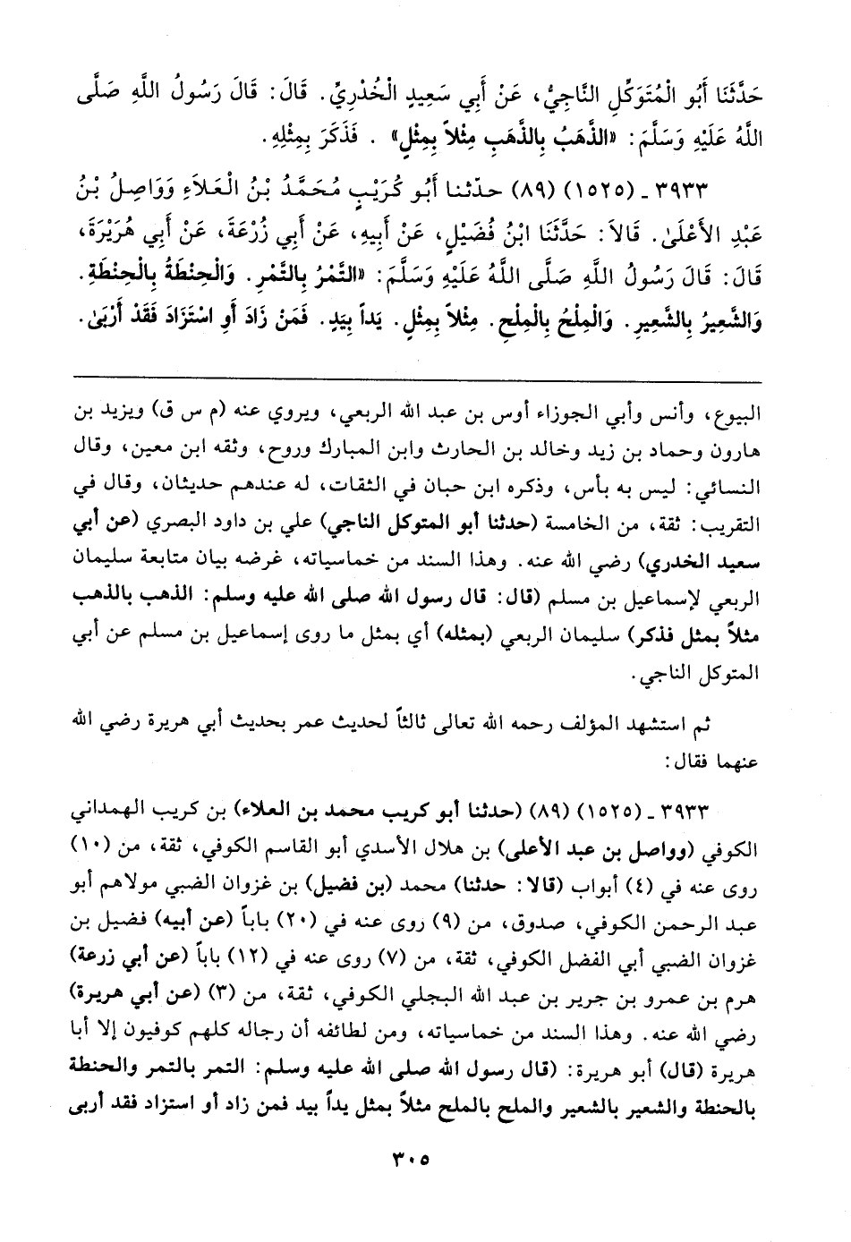 ٣٩٣٣ - (١٥٢٥) (٨٩) (حدثنا أبو كريب محمد بن العلاء) بن كريب الهمداني الكوفي (وواصل بن عبد الأعلى) بن هلال الأسدي أبو القاسم الكوفي، ثقة، من (١٠) روى عنه في (٤) أبواب (قالا: حدثنا) محمد (بن فضيل) بن غزوان الضبي مولاهم أبو عبد الرحمن الكوفي، صدوق، من (٩) روى عنه في (٢٠) بابا (عن أبيه) فضيل بن غزوان الضبي أبي الفضل الكوفي، ثقة، من (٧) روى عنه في (١٢) بابا (عن أبي زرعة) هرم بن عمرو بن جرير بن عبد الله البجلي الكوفي، ثقة، من (٣) (عن أبي هريرة) رضي الله عنه. وهذا السند من خماسياته، ومن لطائفه أن رجاله كلهم كوفيون إلا أبا هريرة (قال) أبو هريرة: (قال رسول الله صلى الله عليه وسلم: التمر بالتمر والحنطة بالحنطة والشعير بالشعير والملح بالملح مثلًا بمثل يدًا بيد فمن زاد أو استزاد فقد أربى