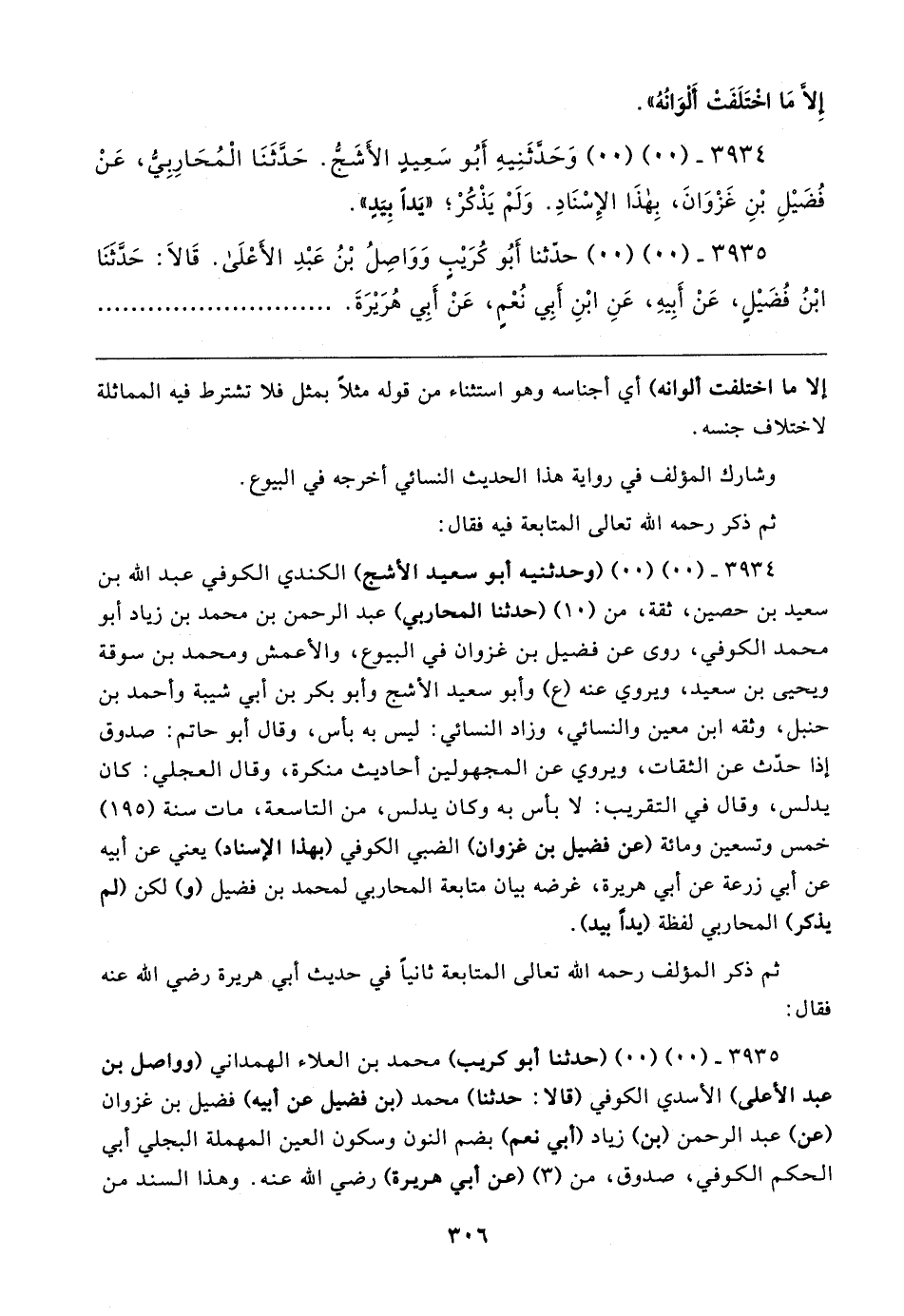 ٣٩٣٤ - (٠٠) (٠٠) (وحدثنيه أبو سعيد الأشج) الكندي الكوفي عبد الله بن سعيد بن حصين، ثقة، من (١٠) (حدثنا المحاربي) عبد الرحمن بن محمد بن زياد أبو محمد الكوفي، روى عن فضيل بن غزوان في البيوع، والأعمش ومحمد بن سوقة ويحيى بن سعيد، ويروي عنه (ع) وأبو سعيد الأشج وأبو بكر بن أبي شيبة وأحمد بن حنبل، وثقه ابن معين والنسائي، وزاد النسائي: ليس به باس، وقال أبو حاتم: صدوق إذا حدّث عن الثقات، ويروي عن المجهولين أحاديث منكرة، وقال العجلي: كان يدلس، وقال في التقريب: لا بأس به وكان يدلس، من التاسعة، مات سنة (١٩٥) خمس وتسعين ومائة (عن فضيل بن غزوان) الضبي الكوفي (بهذا الإسناد) يعني عن أبيه عن أبي زرعة عن أبي هريرة، غرضه بيان متابعة المحاربي لمحمد بن فضيل (و) لكن الم يذكر) المحاربي لفظة (يدًا بيد).