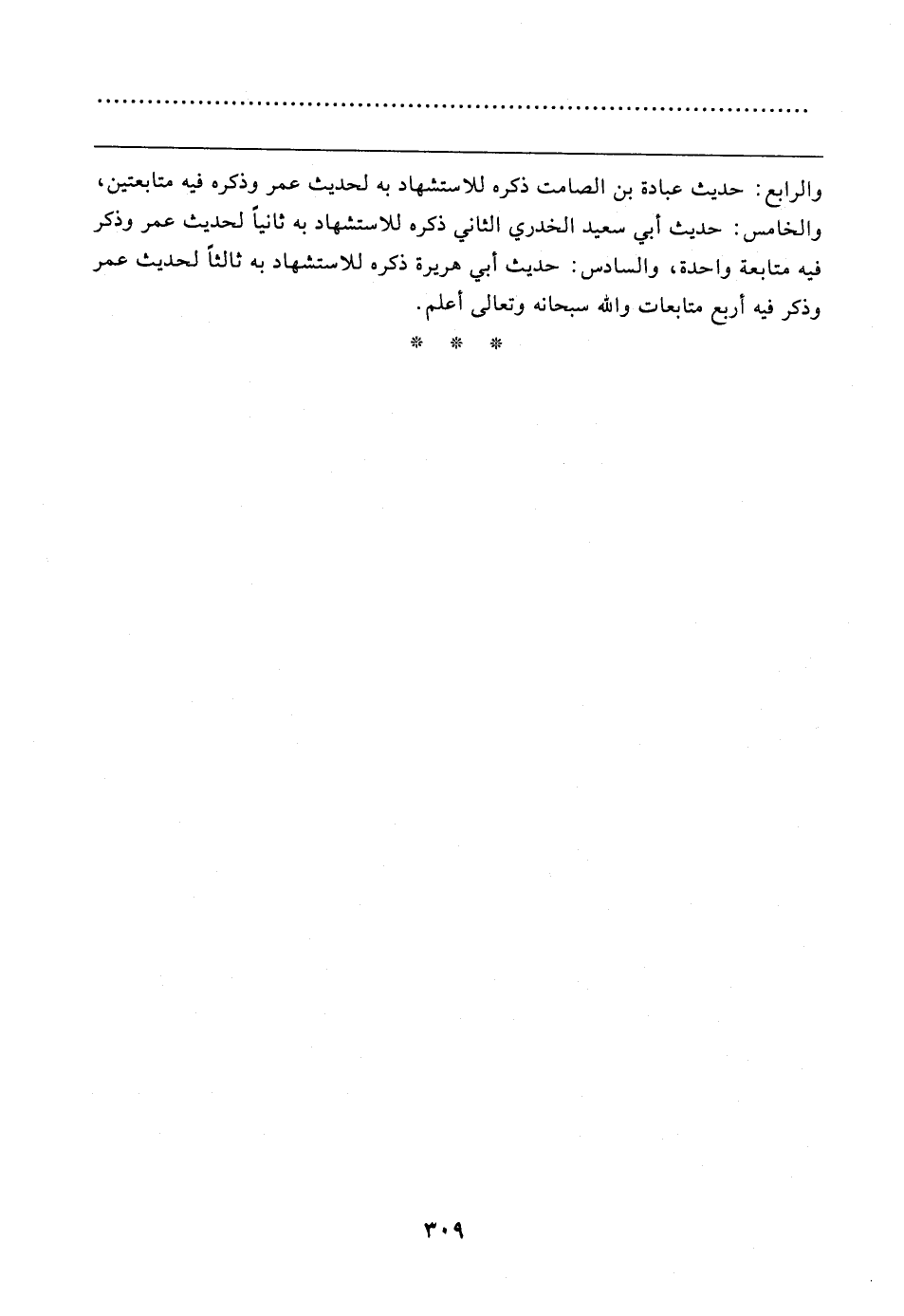 والرابع: حديث عبادة بن الصامت ذكره للاستشهاد به لحديث عمر وذكره فيه متابعتين، والخامس: حديث أبي سعيد الخدري الثاني ذكره للاستشهاد به ثانيًا لحديث عمر وذكر فيه متابعة واحدة، والسادس: حديث أبي هريرة ذكره للاستشهاد به ثالثًا لحديث عمر وذكر فيه أربع متابعات والله سبحانه وتعالى أعلم