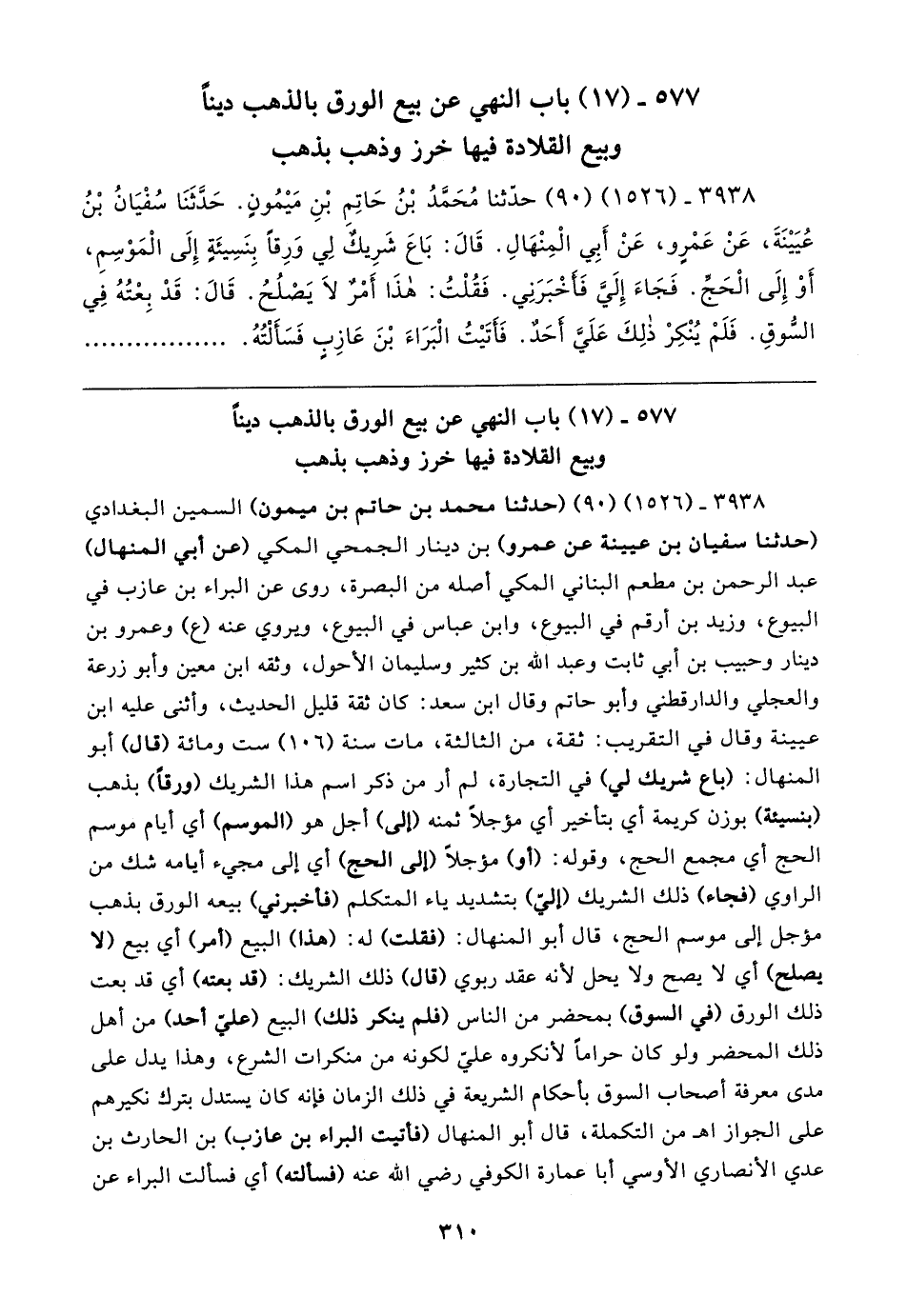 ٣٩٣٨ - (١٥٢٦) (٩٠) حدثنا مُحَمّدُ بْنُ حَاتِمِ بْنِ مَيمُونٍ. حَدَّثَنَا سُفْيَانُ بْنُ عُيَينَةَ، عَنْ عَمْرٍو، عَنْ أَبِي الْمِنْهَالِ. قَال: بَاعَ شَريكٌ لِي وَرِقًا بِنَسِيئَةٍ إِلَى الْمَوْسِمِ، أَوْ إِلَى الْحَجِّ. فَجَاءَ إِلَيَّ فَأخْبَرَنِي. فَقُلْتُ: هذَا أمْرٌ لَا يَصْلُحُ. قَال: قَدْ بِعْتُهُ فِي السُّوقِ. فَلَمْ يُنْكِرْ ذلِكَ عَلَيَّ أحَدٌ. فَأتَيتُ الْبَرَاءَ بْنَ عَازِبٍ فَسَأَلْتُهُ
