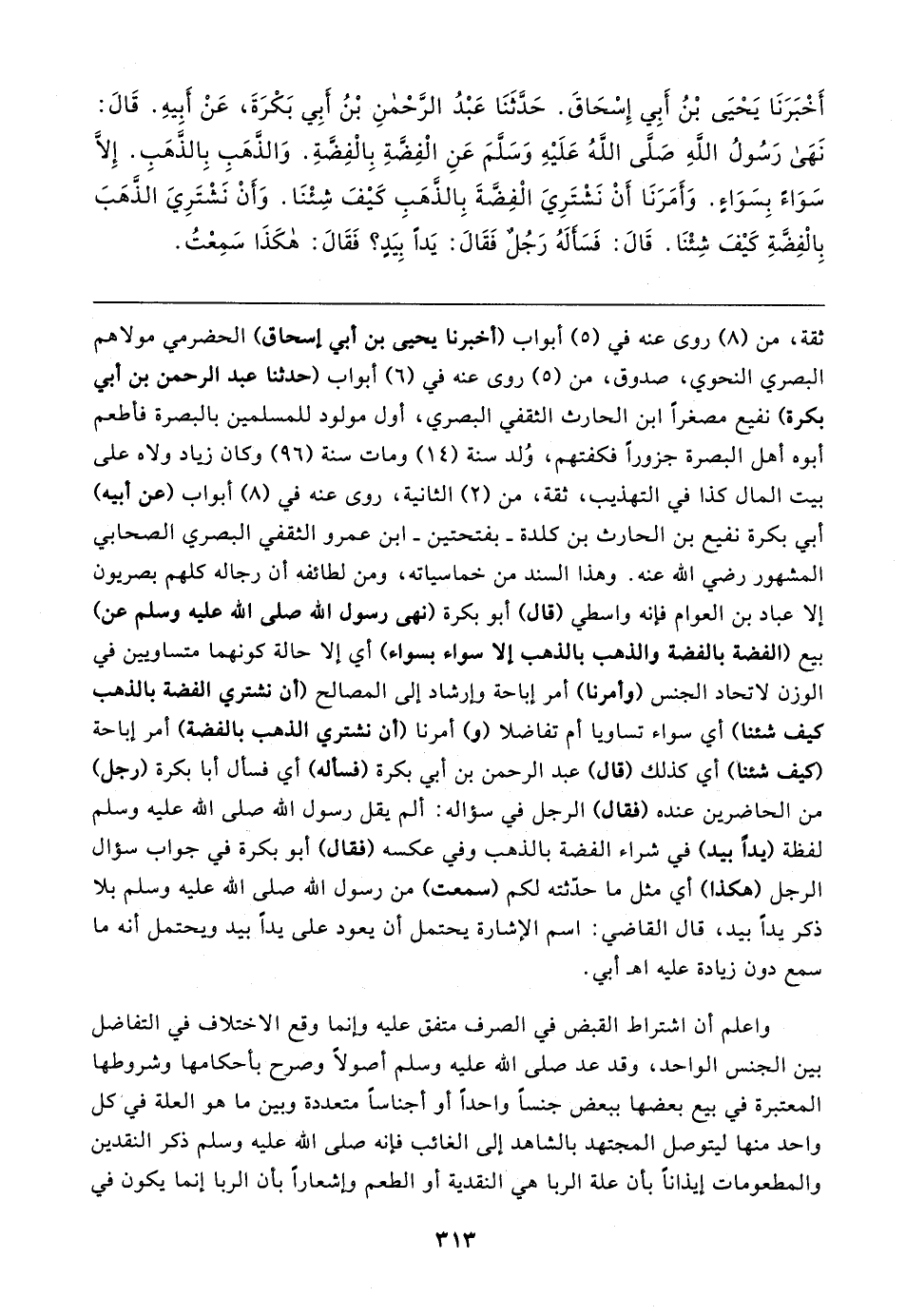 ثقة، من (٨) روى عنه في (٥) أبواب (أخبرنا يحيى بن أبي إسحاق) الحضرمي مولاهم البصري النحوي، صدوق، من (٥) روى عنه في (٦) أبواب (حدثنا عبد الرحمن بن أبي بكرة) نفيع مصغرًا ابن الحارث الثقفي البصري، أول مولود للمسلمين بالبصرة فأطعم أبوه أهل البصرة جزورًا فكفتهم، وُلد سنة (١٤) ومات سنة (٩٦) وكان زياد ولاه على بيت المال كذا في التهذيب، ثقة، من (٢) الثانية، روى عنه في (٨) أبواب (عن أبيه) أبي بكرة نفيع بن الحارث بن كلدة -بفتحتين- ابن عمرو الثقفي البصري الصحابي المشهور رضي الله عنه. وهذا السند من خماسياته، ومن لطائفه أن رجاله كلهم بصريون إلا عباد بن العوام فإنه واسطي (قال) أبو بكرة (نهى رسول الله صلى الله عليه وسلم عن) بيع (الفضة بالفضة والذهب بالذهب إلا سواء بسواء) أي إلا حالة كونهما متساويين في الوزن لاتحاد الجنس (وأمرنا) أمر إباحة وإرشاد إلى المصالح (أن نشتري الفضة بالذهب كيف شئنا) أي سواء تساويا أم تفاضلا (و) أمرنا (أن نشتري الدهب بالفضة) أمر إباحة كيف شئنا) أي كذلك (قال) عبد الرحمن بن أبي بكرة (فسأله) أي فسأل أبا بكرة (رجل) من الحاضرين عنده (فقال) الرجل في سؤاله: ألم يقل رسول الله صلى الله عليه وسلم لفظة (يدًا بيد) في شراء الفضة بالذهب وفي عكسه (فقال) أبو بكرة في جواب سؤال الرجل (هكذا) أي مثل ما حدّثته لكم (سمعت) من رسول الله صلى الله عليه وسلم بلا ذكر يدًا بيد، قال القاضي: اسم الإشارة يحتمل أن يعود على يدًا بيد ويحتمل أنه ما سمع دون زيادة عليه اهـ أبي.