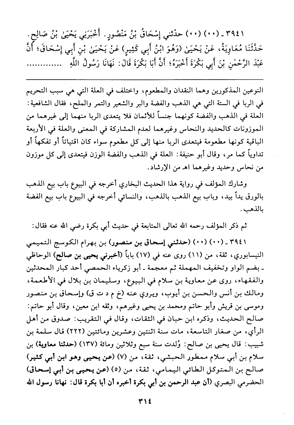 ٣٩٤١ - (٠٠) (٠٠) (حدثني إسحاق بن منصور) بن بهرام الكوسج التميمي النيسابوري، ثقة، من (١١) روى عنه في (١٧) بابا (أخبرني يحيى بن صالح) الوحاظي -بضم الواو وتخفيف المهملة ثم معجمة- أبو زكرياء الحمصي أحد كبار المحدثين والفقهاء، روى عن معاوية بن سلام في البيوع، وسليمان بن بلال في الأطعمة، ومالك بن أنس والحسن بن أيوب، ويروي عنه (خ م دت ق) وإسحاق بن منصور وموسى بن قريش وأبو حاتم ومحمد بن يحيى وغيرهم، وثقه ابن معين، وقال أبو حاتم: صالح الحديث، وذكره ابن حبان في الثقات، وقال في التقريب: صدوق من أهل الرأي، من صغار التاسعة، مات سنة اثنتين وعشرين ومائتين (٢٢٢) قال سلمة بن شبيب: قال يحيى بن صالح: وُلدت سنة سبع وثلاثين ومائة (١٣٧) (حدثنا معاوية) بن سلام بن أبي سلام ممطور الحبشي، ثقة، من (٧) (عن يحيى وهو ابن أبي كثير) صالح بن المتوكل الطائي اليمامي، ثقة، من (٥) (عن يحيى بن أبي إسحاق) الحضرمي البصري (أن عبد الرحمن بن أبي بكرة أخبره أن أبا بكرة قال: نهانا رسول الله