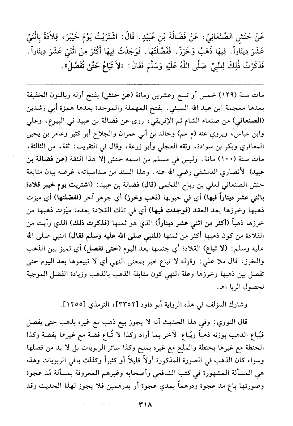 عَنْ حَنَشٍ الصَّنْعَانِيِّ، عَنْ فَضَالةَ بْنِ عُبَيدٍ. قَال: اشْتَرَيتُ يَوْمَ خَيبَرَ، قِلادَةَ بِاثْنَي عَشَرَ دِينَارًا. فِيهَا ذَهَبٌ وَخَرَزٌ. فَفَضَلْتُهَا. فَوَجَدْتُ فِيهَا أَكْثَرَ مِنَ اثْنَي عَشَرَ دِينَارًا. فَذَكَرْتُ ذلِكَ لِلنبِي صَلى اللهُ عَلَيهِ وَسَلمَ فَقَال: "لَا تُبَاعُ حَتَّى تُفَصَّلَ"