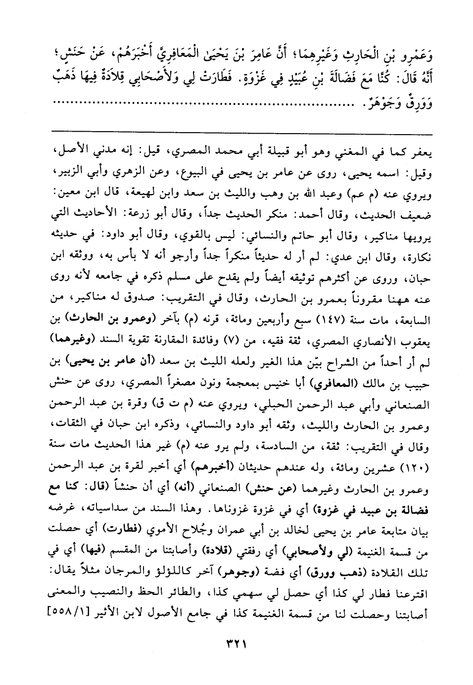 وَعَمْرِو بْنِ الْحَارِثِ وَغَيرِهِمَا؛ أَن عَامِرَ بْنَ يَحْيَى الْمَعَافِرِيَّ أَخْبَرَهُمْ، عَنْ حَنَشٍ؛ أَنهُ قَال: كُنا مَعَ فَضَالةَ بْنِ عُبَيدِ فِي غَزْوَةٍ. فَطَارَتْ لِي وَلاصْحَابِي قِلادَةٌ فِيهَا ذَهَبٌ وَوَرِقٌ وَجَوْهَرٌ
