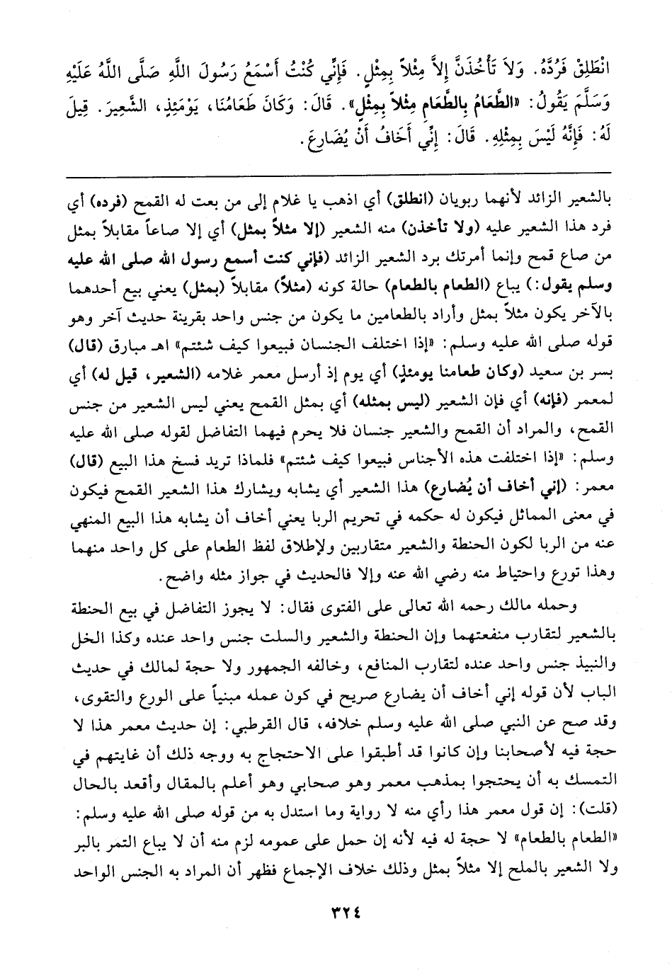 انْطَلِقْ فَرُدَّهُ. وَلَا تَأْخُذَنَّ إلا مِثْلا بِمِثْل. فَإِني كُنْتُ أَسْمَعُ رَسُولَ الله صَلَّى الله عَلَيهِ وسلَّمَ يَقُولُ: "الطعَامُ بِالطعَامِ مِثْلا بِمِثْلٍ". قَال: وَكَانَ طَعَامُنَا، يَوْمَئِذٍ، الشعِيرَ. قِيلَ لَهُ: فَإِنهُ لَيسَ بِمِثْلِهِ. قَال: إِني أَخَافُ أَنْ يُضَارعَ