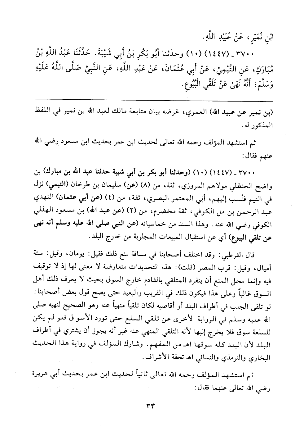٣٧٠٠ - (١٤٤٧) (١٠) (وحدثنا أبو بكر بن أبي شيبة حدثنا عبد الله بن مبارك) بن واضح الحنظلي مولاهم المروزي، ثقة، من (٨) (عن) سليمان بن طرخان (التيمي) نزل في التيم فنُسب إليهم، أبي المعتمر البصري، ثقة، من (٤) (عن أبي عثمان) النهدي عبد الرحمن بن مل الكوفي، ثقة مخضرم، من (٢) (عن عبد الله) بن مسعود الهذلي الكوفي رضي الله عنه. وهذا السند من خماسياته (عن النبي صلى الله عليه وسلم أنه نهى عن تلقي البيوع) أي عن استقبال المبيعات المجلوبة من خارج البلد.