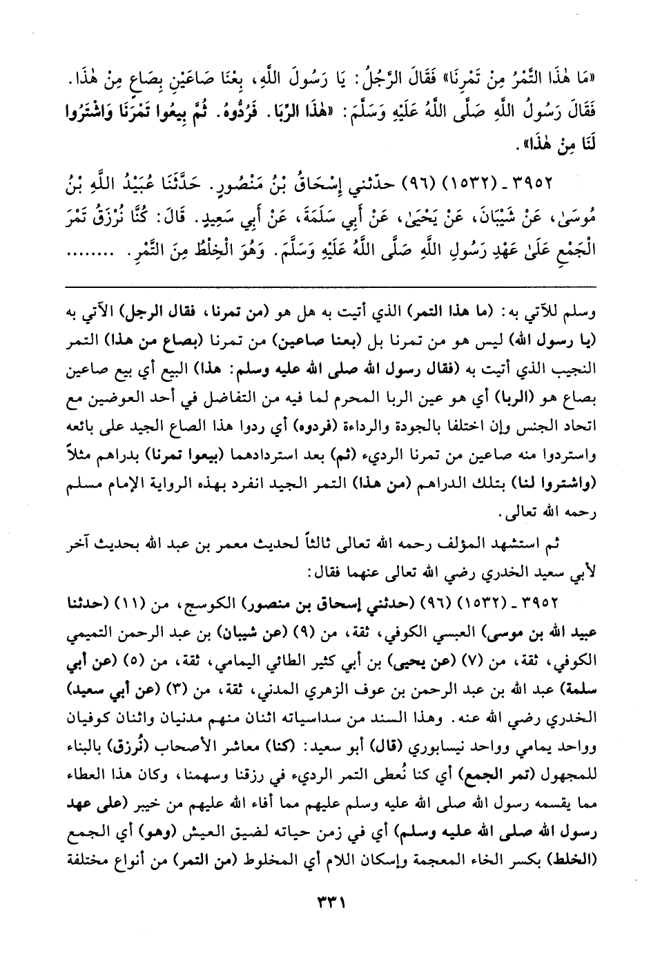 ٣٩٥٢ - (١٥٣٢) (٩٦) (حدثني إسحاق بن منصور) الكوسج، من (١١) (حدثنا عبيد الله بن موسى) العبسي الكوفي، ثقة، من (٩) (عن شيبان) بن عبد الرحمن التميمي الكوفي، ثقة، من (٧) (عن يحيى) بن أبي كثير الطائي اليمامي، ثقة، من (٥) (عن أبي سلمة) عبد الله بن عبد الرحمن بن عوف الزهريّ المدني، ثقة، من (٣) (عن أبي سعيد) الخدري رضي الله عنه. وهذا السند من سداسياته اثنان منهم مدنيان واثنان كوفيان وواحد يمامي وواحد نيسابوري (قال) أبو سعيد: (كنا) معاشر الأصحاب (نُرزق) بالبناء للمجهول (تمر الجمع) أي كنا نُعطى التمر الرديء في رزقنا وسهمنا، وكان هذا العطاء مما يقسمه رسول الله صلى الله عليه وسلم عليهم مما أفاء الله عليهم من خيبر (على عهد رسول الله صلى الله عليه وسلم) أي في زمن حياته لضيق العيش (وهو) أي الجمع (الخلط) بكسر الخاء المعجمة وإسكان اللام أي المخلوط (من التمر) من أنواع مختلفة