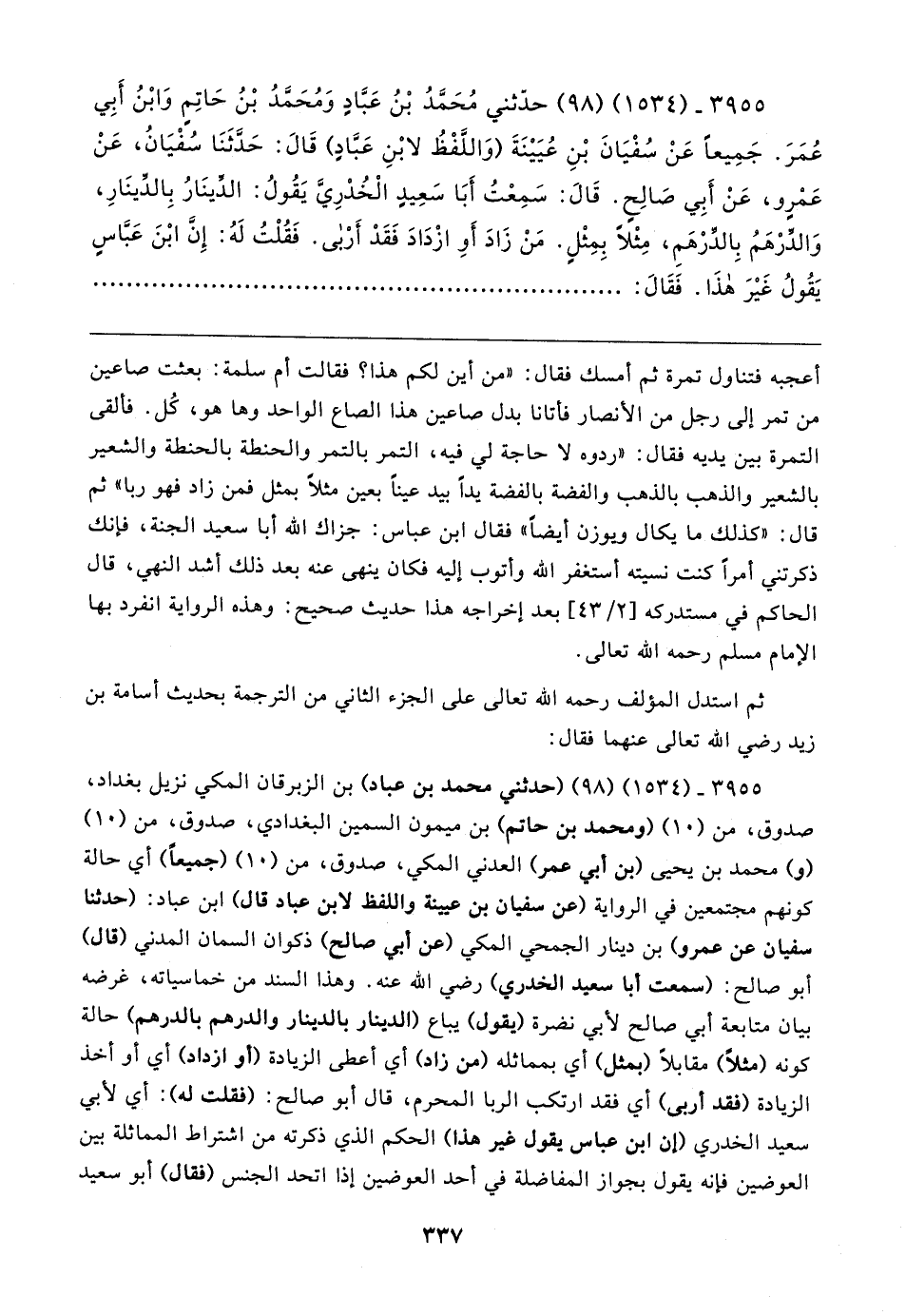 ٣٩٥٥ - (١٥٣٤) (٩٨) حدّثني مُحَمَّدُ بْنُ عَبَّادٍ وَمُحَمَّدُ بْنُ حَاتِمٍ وَابْنُ أَبِي عُمَرَ. جَمِيعًا عَنْ سُفْيَانَ بْنِ عُيَينَةَ (وَاللَّفْظُ لابْنِ عَبَّادٍ) قَال: حَدَّثَنَا سُفْيَانُ، عَنْ عَمْرٍو، عَنْ أَبِي صَالِحٍ. قَال: سَمِعْتُ أبا سَعِيدٍ الْخُدْرِيَّ يَقُولُ: الدِّينَارُ بِالدِّينَارِ، وَالدِّرْهَمُ بِالدِّرْهَمِ، مِثْلا بِمِثْلٍ. مَنْ زَادَ أَو ازْدَادَ فَقَدْ أَرْبى. فَقُلْتُ لَهُ: إِنَّ ابْنَ عَبَّاسٍ يَقُولُ غَيرَ هذَا. فَقَال: