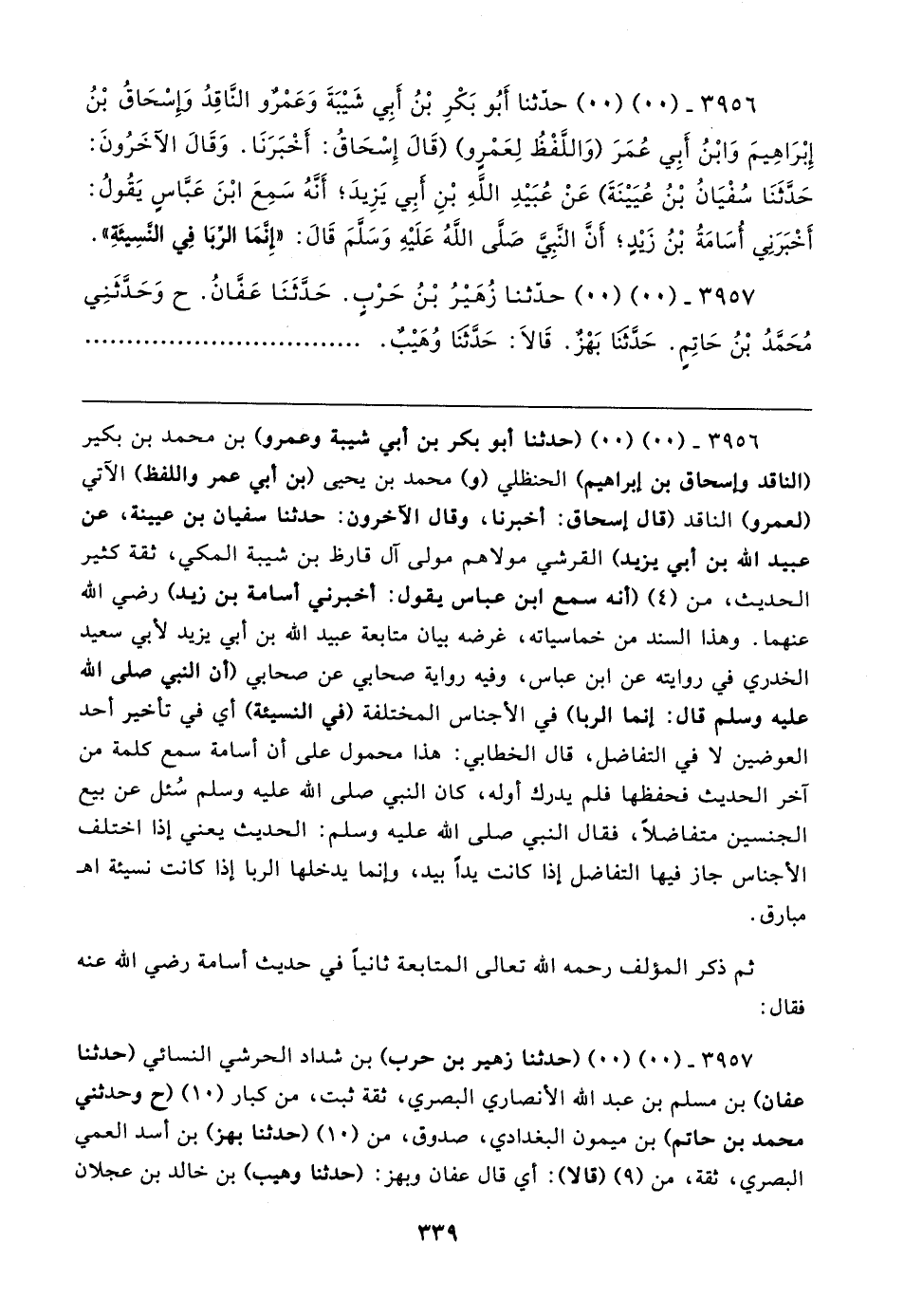 ٣٩٥٦ - (٠٠) (٠٠) حدثنا أَبُو بَكْرِ بْنُ أَبِي شَيبَةَ وَعَمْرٌو النَّاقِدُ وَإِسْحَاقُ بْنُ إِبْرَاهِيمَ وَابْنُ أَبِي عُمَرَ (وَاللَّفْظُ لِعَمْرٍو) (قَال إِسْحَاقُ: أَخْبَرَنَا. وَقَال الآخَرُونَ: حَدَّثَنَا سُفْيَانُ بْنُ عُيَينَةَ) عَنْ عُبَيدِ الله بْنِ أبي يَزِيدَ؛ أَنَّهُ سَمِعَ ابْنَ عَبَّاسٍ يَقُولُ: أَخْبَرَنِي أسَامَةُ بْنُ زيدٍ؛ أَنَّ النَّبِيَّ صَلى الله عَلَيهِ وسلَّمَ قَال: "إِنما الربَا في النَّسِيئَةِ".