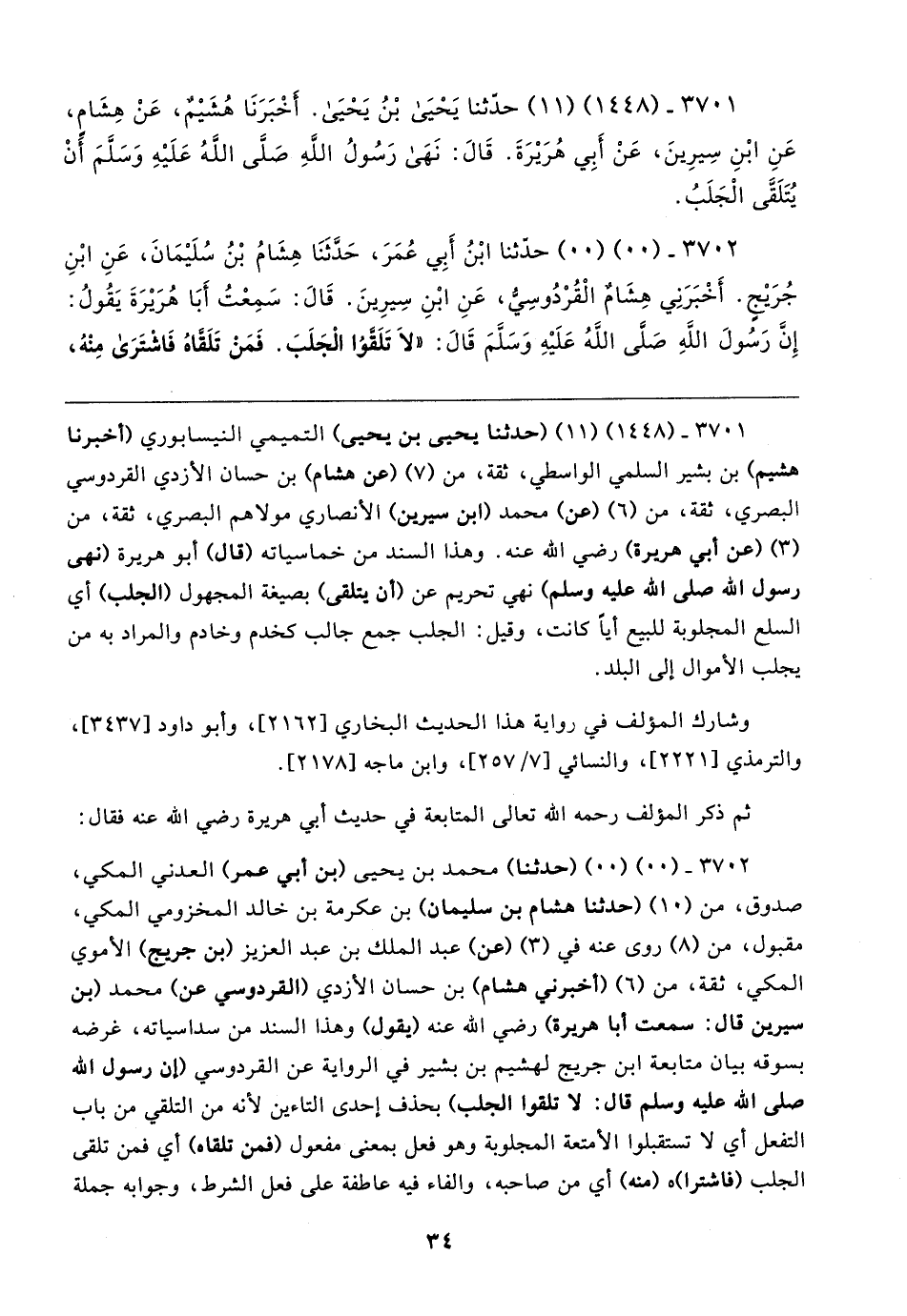 ٣٧٠١ - (١٤٤٨) (١١) (حدثنا يحيى بن يحيى) التميمي النيسابوري (أخبرنا هشيم) بن بشير السلمي الواسطي، ثقة، من (٧) (عن هشام) بن حسان الأزدي القردوسي البصري، ثقة، من (٦) (عن) محمد (ابن سيرين (الأنصاري مولاهم البصري، ثقة، من (٣) (عن أبي هريرة) رضي الله عنه. وهذا السند من خماسياته (قال) أبو هريرة (نهى رسول الله صلى الله عليه وسلم) نهي تحريم عن (أن يتلقى) بصيغة المجهول (الجلب) أي السلع المجلوبة للبيع أيًّا كانت، وقيل: الجلب جمع جالب كخدم وخادم والمراد به من يجلب الأموال إلى البلد.