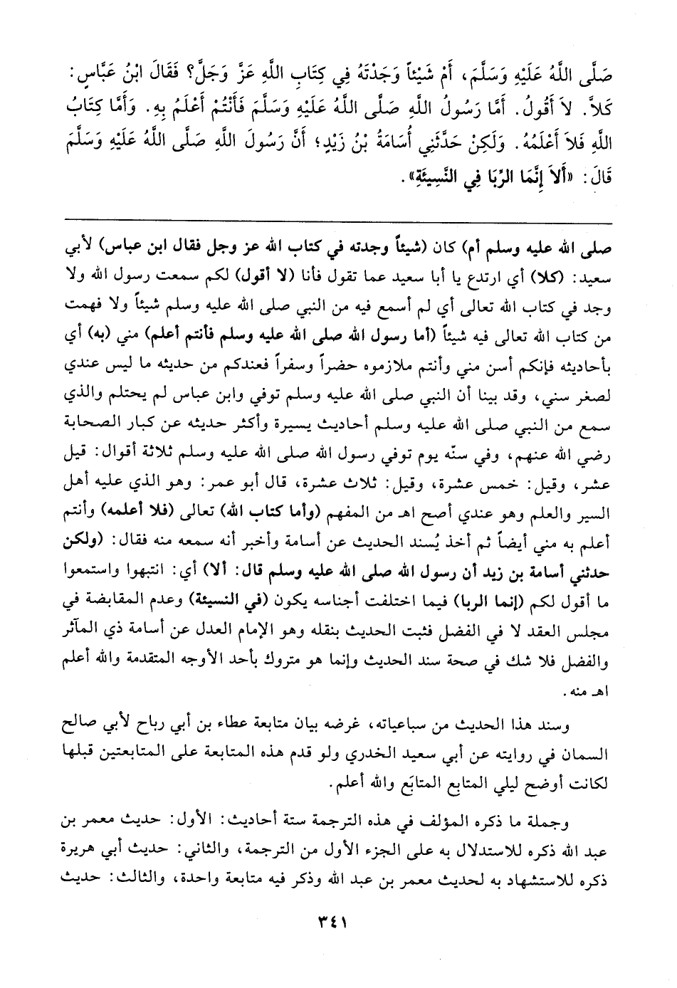 صلى الله عَلَيهِ وَسلمَ، أَمْ شَيئًا وَجَدْتَهُ في كِتَابِ الله عَزَّ وَجلَّ؟ فَقَال ابْنُ عَبَّاسٍ: كَلَّا. لَا أَقُولُ. أما رَسُولُ الله صلى الله عَلَيهِ وَسلمَ فَأَنْتُمْ أَعْلَمُ بِهِ. وَأَمَّا كِتَابُ الله فَلَا أَعْلَمُهُ. وَلَكِنْ حَدَّثَنِي أُسَامَةُ بْنُ زَيدٍ؛ أن رَسُولَ الله صلى الله عَلَيهِ وَسلمَ قَال: "أَلا إِنَّمَا الرِّبَا في النَّسِيئَةِ"