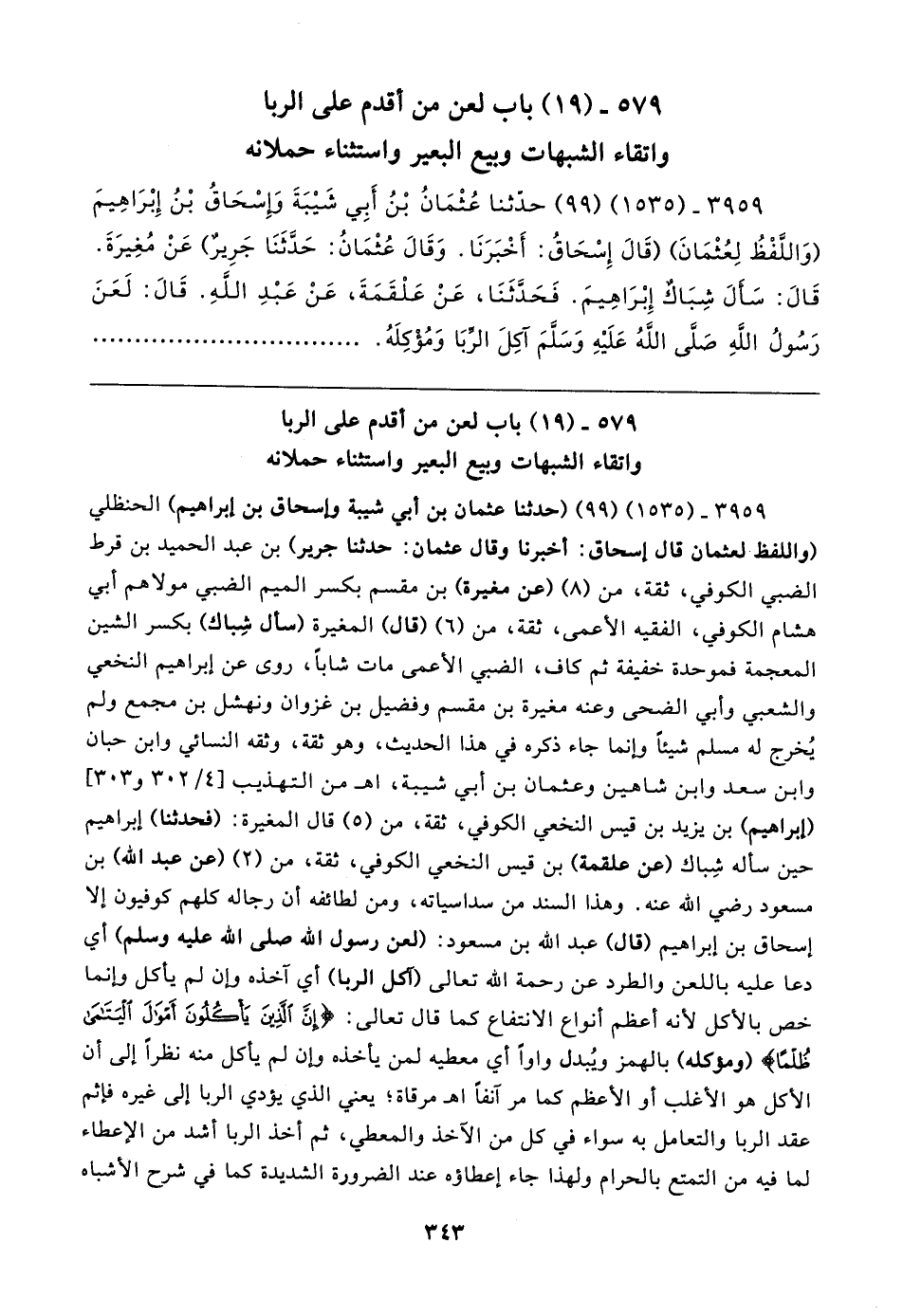 ٣٩٥٩ - (١٥٣٥) (٩٩) حدثنا عُثْمَانُ بْنُ أَبِي شَيبَةَ وإسْحَاقُ بْنُ إِبْرَاهِيمَ (وَاللَّفْظُ لِعُثْمَانَ) (قَال إِسْحَاقُ: أَخْبَرَنَا. وَقَال عُثْمَانُ: حَدَّثَنَا جَرِيرٌ) عَنْ مُغِيرَةَ. قَال: سألَ شِبَاكٌ إِبْرَاهِيمَ. فَحَدَّثَنَا، عَنْ عَلْقَمَةَ، عَنْ عَبْدِ الله. قَال: لَعَنَ رَسُولُ الله صَلَّى الله عَلَيهِ وسلَّمَ آكِلَ الربَا وَمُؤْكِلَهُ
