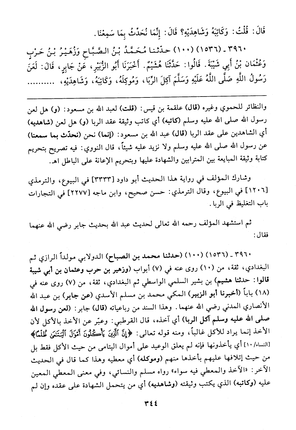 ٣٩٦٠ - (١٥٣٦) (١٠٠) حدثنا مُحَمَّدُ بْنُ الصَّبَّاحِ وَزُهَيرُ بْنُ حَرْبٍ وَعُثْمَان بْنُ أَبِي شَيبَةَ. قَالُوا: حَدَّثنَا هُشَيمٌ. أَخْبَرَنَا أَبُو الزبَيرِ، عَنْ جَابِرٍ، قَال: لَعَنَ رَسُولُ اللهِ صَلَّى اللهُ عَلَيهِ وسلَّمَ آكِلَ الرِّبَا، وَمُوكِلَهُ، وَكَاتِبَهُ، وَشَاهِدَيهِ،