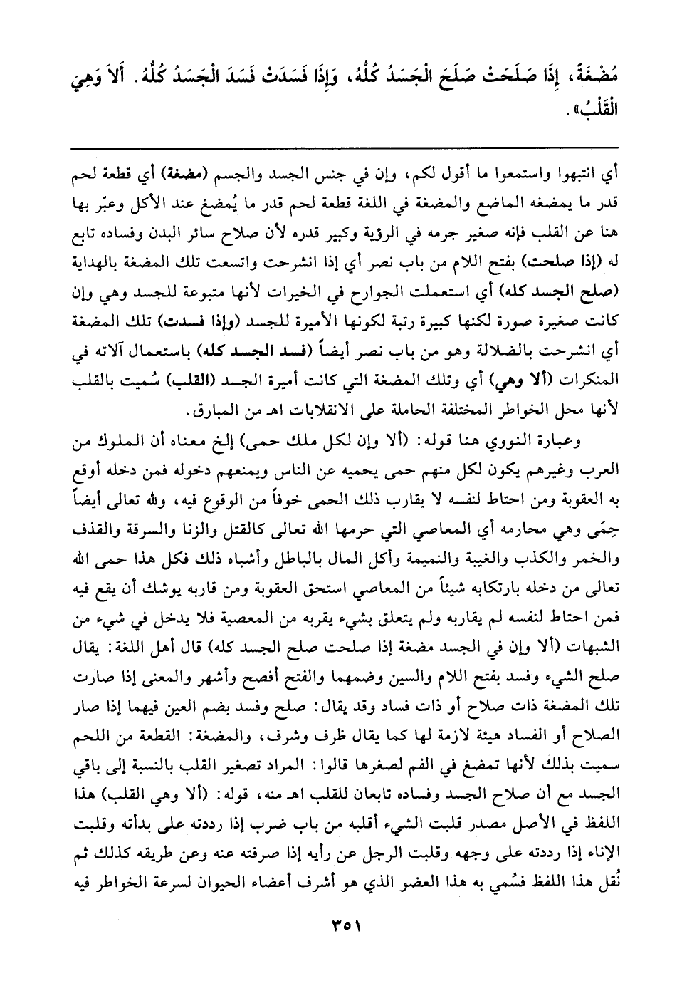 مُضْغَةً، إِذَا صَلَحَتْ صَلَحَ الْجَسَدُ كُلُّهُ، وَإذَا فَسَدَتْ فَسَدَ الْجَسَدُ كُلُّهُ. أَلا وَهِيَ الْقَلْبُ"