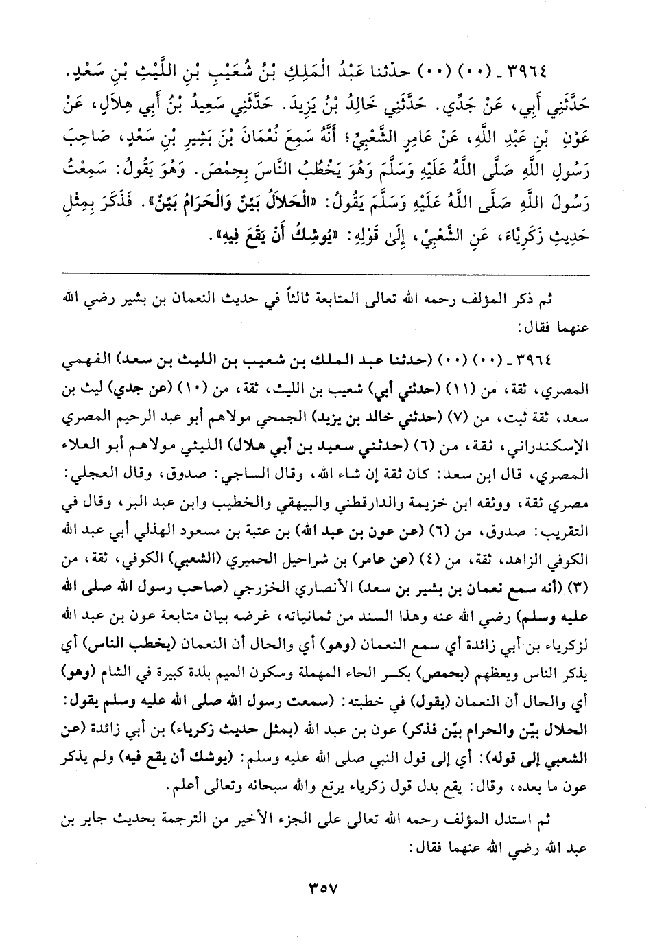 ٣٩٦٤ - (٠٠) (٠٠) (حدثنا عبد الملك بن شعيب بن الليث بن سعد) الفهمي المصري، ثقة، من (١١) (حدثني أبي) شعيب بن الليث، ثقة، من (١٠) (عن جدي) ليث بن سعد، ثقة ثبت، من (٧) (حدثني خالد بن يزيد) الجمحي مولاهم أبو عبد الرحيم المصري الإسكندراني، ثقة، من (٦) (حدثني سعيد بن أبي هلال) الليثي مولاهم أبو العلاء المصري، قال ابن سعد: كان ثقة إن شاء الله، وقال الساجي: صدوق، وقال العجلي: مصري ثقة، ووثقه ابن خزيمة والدارقطني والبيهقي والخطيب وابن عبد البر، وقال في التقريب: صدوق، من (٦) (عن عون بن عبد الله) بن عتبة بن مسعود الهذلي أبي عبد الله الكوفي الزاهد، ثقة، من (٤) (عن عامر) بن شراحيل الحميري (الشعبي) الكوفي، ثقة، من (٣) (أنه سمع نعمان بن بشير بن سعد) الأنصاري الخزرجي (صاحب رسول الله صلى الله عليه وسلم) رضي الله عنه وهذا السند من ثمانياته، غرضه بيان متابعة عون بن عبد الله لزكرياء بن أبي زائدة أي سمع النعمان (وهو) أي والحال أن النعمان (يخطب الناس) أي يذكر الناس ويعظهم (بحمص) بكسر الحاء المهملة وسكون الميم بلدة كبيرة في الشام (وهو) أي والحال أن النعمان (يقول) في خطبته: (سمعت رسول الله صلى الله عليه وسلم يقول: الحلال بيّن والحرام بيّن فذكر) عون بن عبد الله (بمثل حديث زكرياء) بن أبي زائدة (عن الشعبي إلى قوله): أي إلى قول النبي صلى الله عليه وسلم: (يوشك أن يقع فيه) ولم يذكر عون ما بعده، وقال: يقع بدل قول زكرياء يرتع والله سبحانه وتعالى أعلم.