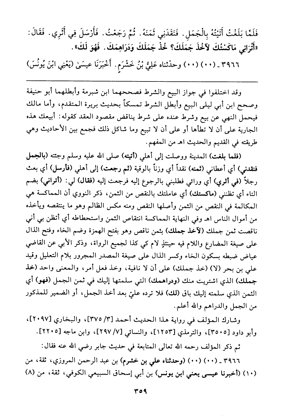 فَلَمَّا بَلَغْتُ أَتَيتُهُ بِالْجَمَلِ. فَنَقَدَنِي ثَمَنَهُ. ثُمَّ رَجَعْتُ. فَأَرْسَلَ في أَثَرِي. فَقَال: "أَتُرَاني مَاكسْتُكَ لآخُذَ جَمَلَكَ؟ خُذْ جَمَلَكَ وَدَرَاهِمَكَ. فَهُوَ لَكَ".