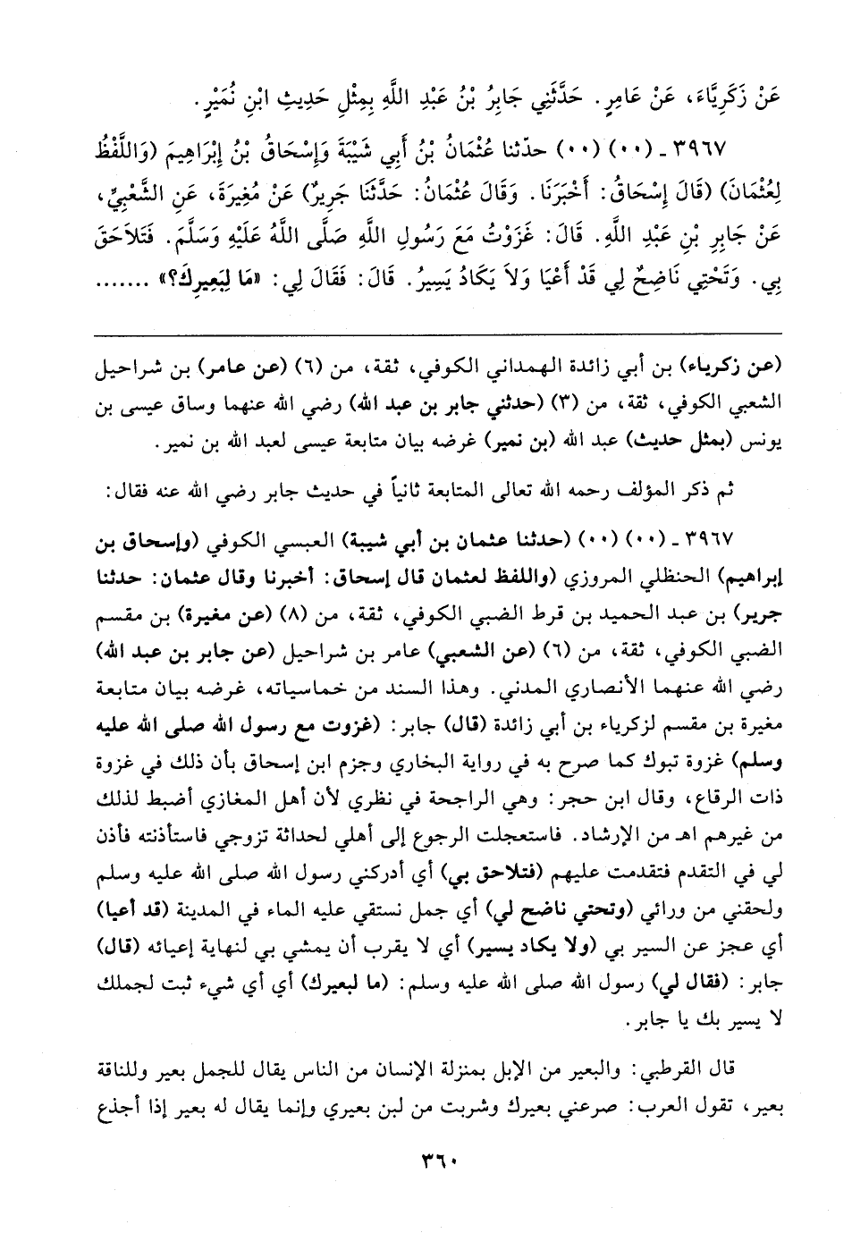 ٣٩٦٧ - (٠٠) (٠٠) حدْثنا عُثْمَانُ بْنُ أبي شَيبَةَ وَإِسْحَاقُ بْنُ إِبْرَاهِيمَ (وَاللَّفْظُ لِعُثْمَانَ) (قَال إِسْحَاقُ: أَخْبَرَنَا. وَقَال عُثْمَانُ: حَدَّثنَا جَرِيرٌ) عَنْ مُغِيرَةَ، عَنِ الشَّعْبِيِّ، عَنْ جَابِرِ بْنِ عَبْدِ الله. قَال: غَزَوْتُ مَعَ رَسُولِ اللهِ صَلى اللهُ عَلَيهِ وسلَّمَ. فَتَلاحَقَ بِي. وَتَحْتِي نَاضِحٌ لِي قَدْ أَعْيَا وَلَا يَكَادُ يَسِيرُ. قَال: فَقَال لِي: "مَا لِبَعِيرِكَ؟ "